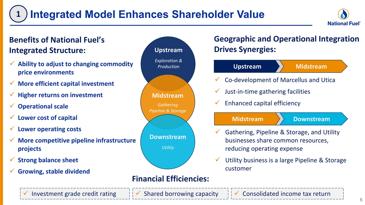 Why National Fuel? Diversified Assets Provide Stability and Long-Term Growth Opportunities Integrated Model Enhances Shareholder Value 1 Consolidated Business Expected to Generate Significant Free Cash Flow 2 High Quality Assets Drive Consolidated Growth 3 Long History of Returning Capital to Shareholders 4 Focused on Corporate Responsibility and ESG 5 4