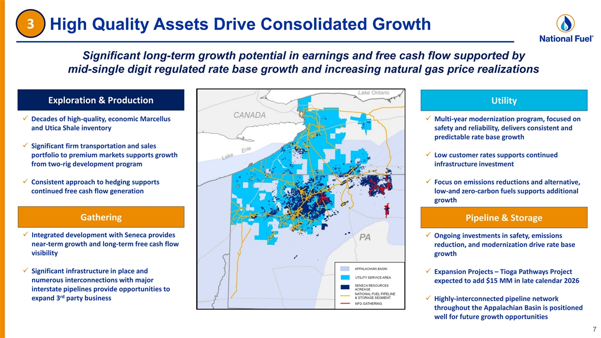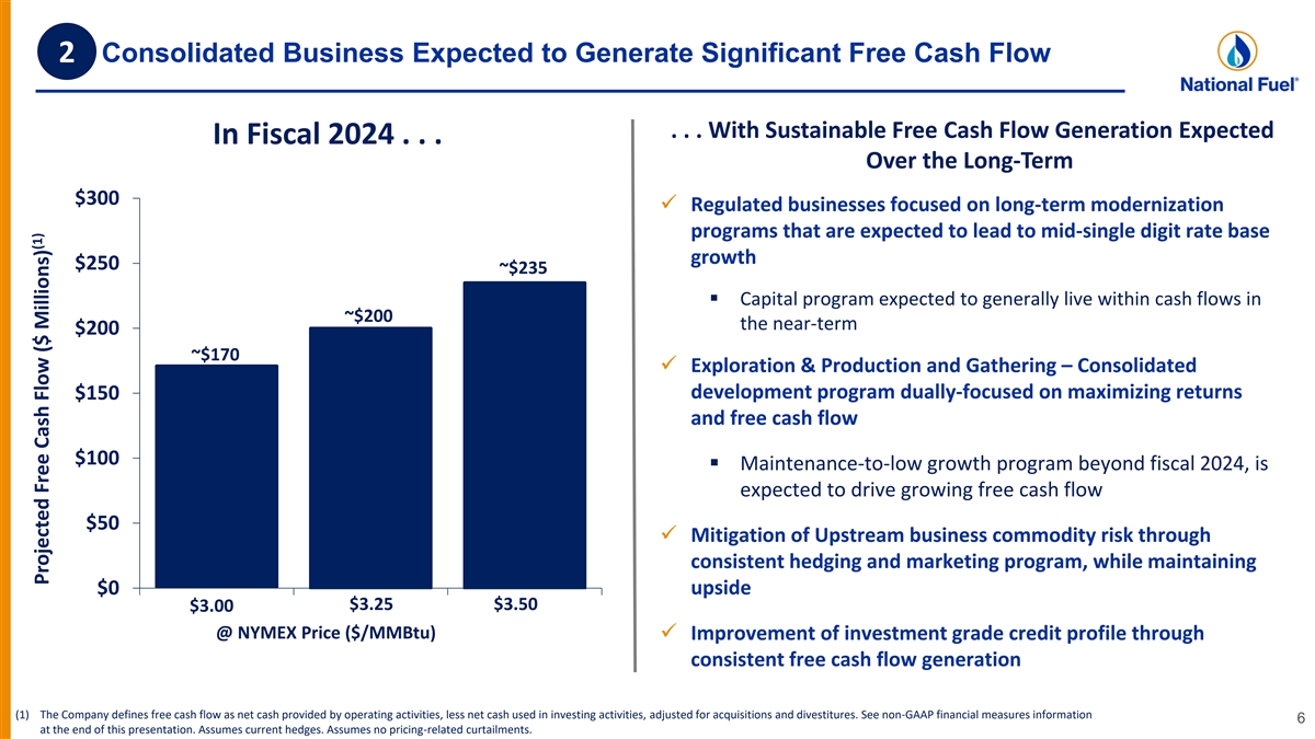 2 Consolidated Business Expected to Generate Significant Free Cash Flow . . . With Sustainable Free Cash Flow Generation Expected In Fiscal 2024 . . . Over the Long-Term $300 ✓ Regulated businesses focused on long-term modernization programs that are expected to lead to mid-single digit rate base growth $250 ~$235 ▪ Capital program expected to generally live within cash flows in ~$200 the near-term $200 ~$170 ✓ Exploration & Production and Gathering – Consolidated development program dually-focused on maximizing returns $150 and free cash flow $100 ▪ Maintenance-to-low growth program beyond fiscal 2024, is expected to drive growing free cash flow $50 ✓ Mitigation of Upstream business commodity risk through consistent hedging and marketing program, while maintaining upside $0 $3.25 $3.50 $3.00 $1.00 $2.00 $3.00 @ NYMEX Price ($/MMBtu) ✓ Improvement of investment grade credit profile through consistent free cash flow generation (1) The Company defines free cash flow as net cash provided by operating activities, less net cash used in investing activities, adjusted for acquisitions and divestitures. See non-GAAP financial measures information 6 at the end of this presentation. Assumes current hedges. Assumes no pricing-related curtailments. (1) Projected Free Cash Flow ($ Millions)