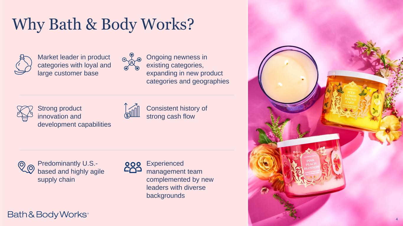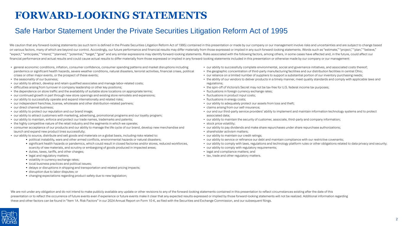Safe Harbor Statement Under the Private Securities Litigation Reform Act of 1995 FORWARD-LOOKING STATEMENTS We caution that any forward-looking statements (as such term is defined in the Private Securities Litigation Reform Act of 1995) contained in this presentation or made by our company or our management involve risks and uncertainties and are subject to change based on various factors, many of which are beyond our control. Accordingly, our future performance and financial results may differ materially from those expressed or implied in any such forward-looking statements. Words such as “estimate,” “project,” “plan,” “believe,” “expect,” “anticipate,” “intend,” “planned,” “potential,” “target,” “goal” and any similar expressions may identify forward-looking statements. Risks associated with the following factors, among others, in some cases have affected and, in the future, could affect our financial performance and actual results and could cause actual results to differ materially from those expressed or implied in any forward-looking statements included in this presentation or otherwise made by our company or our management: We are not under any obligation and do not intend to make publicly available any update or other revisions to any of the forward-looking statements contained in this presentation to reflect circumstances existing after the date of this presentation or to reflect the occurrence of future events even if experience or future events make it clear that any expected results expressed or implied by those forward-looking statements will not be realized. Additional information regarding these and other factors can be found in “Item 1A. Risk Factors” in our 2024 Annual Report on Form 10-K, as filed with the Securities and Exchange Commission, and our subsequent filings. • general economic conditions, inflation, consumer confidence, consumer spending patterns and market disruptions including pandemics or significant health hazards, severe weather conditions, natural disasters, terrorist activities, financial crises, political crises or other major events, or the prospect of these events; • the seasonality of our business; • our ability to attract, develop and retain qualified associates and manage labor-related costs; • difficulties arising from turnover in company leadership or other key positions; • the dependence on store traffic and the availability of suitable store locations on appropriate terms; • our continued growth in part through new store openings and existing store remodels and expansions; • our ability to successfully operate and expand internationally and related risks; • our independent franchise, license, wholesale and other distribution-related partners; • our direct channel business; • our ability to protect our reputation and our brand image; • our ability to attract customers with marketing, advertising, promotional programs and our loyalty program; • our ability to maintain, enforce and protect our trade names, trademarks and patents; • the highly competitive nature of the retail industry and the segments in which we operate; • consumer acceptance of our products and our ability to manage the life cycle of our brand, develop new merchandise and launch and expand new product lines successfully; • our ability to source, distribute and sell goods and materials on a global basis, including risks related to: ▪ political instability, wars and other armed conflicts, environmental hazards or natural disasters; ▪ significant health hazards or pandemics, which could result in closed factories and/or stores, reduced workforces, scarcity of raw materials, and scrutiny or embargoing of goods produced in impacted areas; ▪ duties, taxes, tariffs, and other charges; ▪ legal and regulatory matters; ▪ volatility in currency exchange rates; ▪ local business practices and political issues; ▪ delays or disruptions in shipping and transportation and related pricing impacts; ▪ disruption due to labor disputes; or ▪ changing expectations regarding product safety due to new legislation; • our ability to successfully complete environmental, social and governance initiatives, and associated costs thereof; • the geographic concentration of third-party manufacturing facilities and our distribution facilities in central Ohio; • our reliance on a limited number of suppliers to support a substantial portion of our inventory purchasing needs; • the ability of our vendors to deliver products in a timely manner, meet quality standards and comply with applicable laws and regulations; • the spin-off of Victoria’s Secret may not be tax-free for U.S. federal income tax purposes; • fluctuations in foreign currency exchange rates; • fluctuations in product input costs; • fluctuations in energy costs; • our ability to adequately protect our assets from loss and theft; • claims arising from our self-insurance; • our and our third-party service providers’ ability to implement and maintain information technology systems and to protect associated data; • our ability to maintain the security of customer, associate, third-party and company information; • stock price volatility; • our ability to pay dividends and make share repurchases under share repurchase authorizations; • shareholder activism matters; • our ability to maintain our credit ratings; • our ability to service or refinance our debt and maintain compliance with our restrictive covenants; • our ability to comply with laws, regulations and technology platform rules or other obligations related to data privacy and security; • our ability to comply with regulatory requirements; • legal and compliance matters; and • tax, trade and other regulatory matters. 2