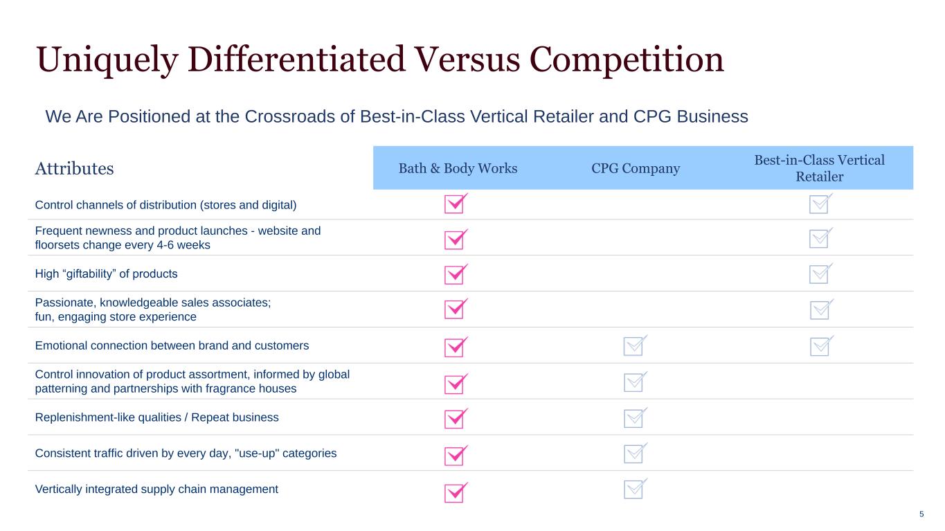Why Bath & Body Works? Market leader in product categories with loyal and large customer base Ongoing newness in existing categories, expanding in new product categories and geographies Strong product innovation and development capabilities Consistent history of strong cash flow Predominantly U.S.- based and highly agile supply chain Experienced management team complemented by new leaders with diverse backgrounds 4