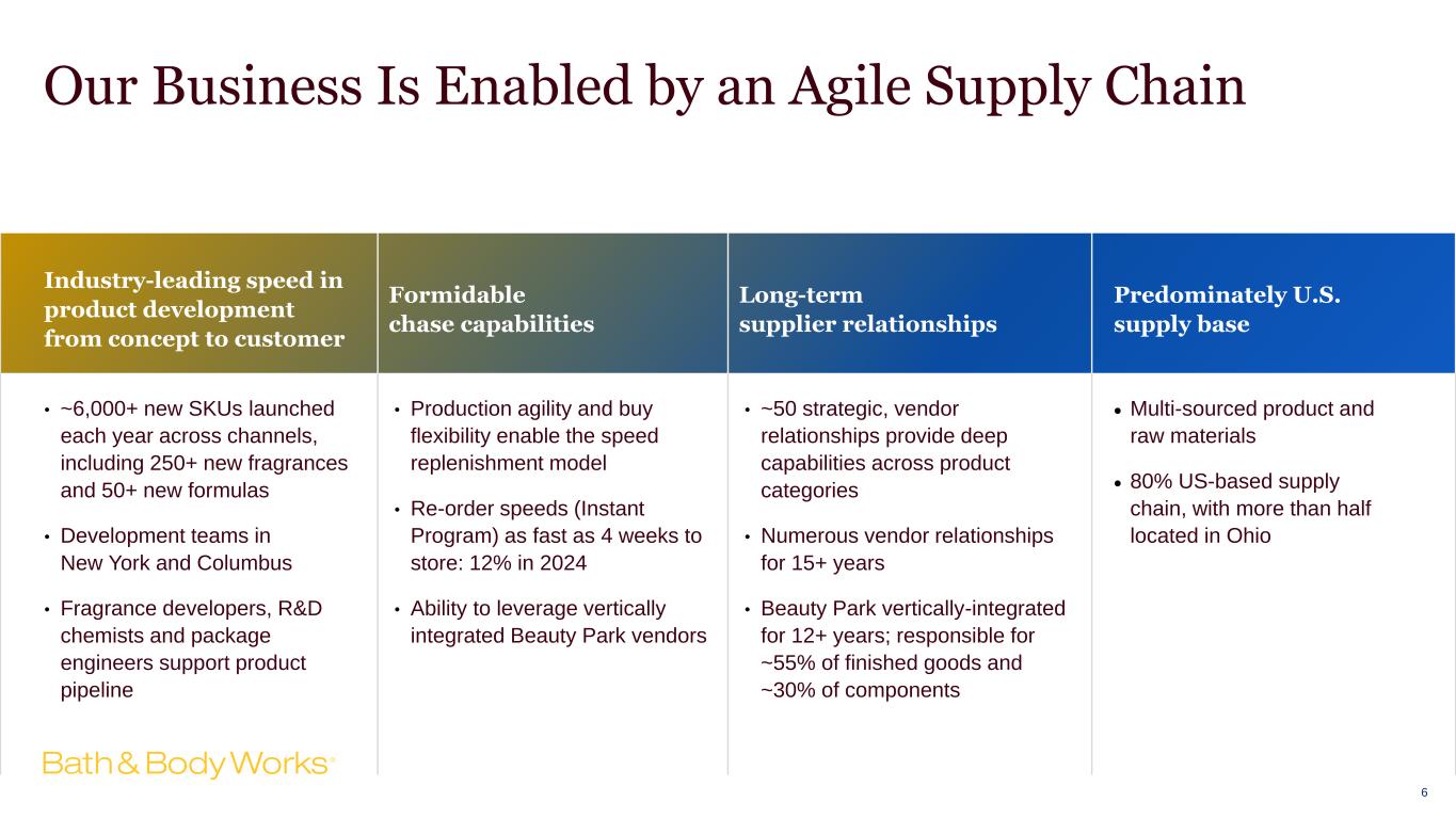 5 We Are Positioned at the Crossroads of Best-in-Class Vertical Retailer and CPG Business Attributes Bath & Body Works CPG Company Best-in-Class Vertical Retailer Control channels of distribution (stores and digital) Frequent newness and product launches - website and floorsets change every 4-6 weeks High “giftability” of products Passionate, knowledgeable sales associates; fun, engaging store experience Emotional connection between brand and customers Control innovation of product assortment, informed by global patterning and partnerships with fragrance houses Replenishment-like qualities / Repeat business Consistent traffic driven by every day, "use-up" categories Vertically integrated supply chain management Uniquely Differentiated Versus Competition
