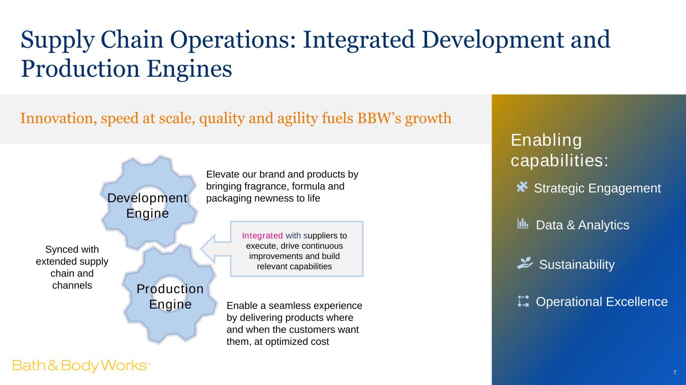 Our Business Is Enabled by an Agile Supply Chain Industry-leading speed in product development from concept to customer Formidable chase capabilities Long-term supplier relationships Predominately U.S. supply base • ~6,000+ new SKUs launched each year across channels, including 250+ new fragrances and 50+ new formulas • Development teams in New York and Columbus • Fragrance developers, R&D chemists and package engineers support product pipeline • Production agility and buy flexibility enable the speed replenishment model • Re-order speeds (Instant Program) as fast as 4 weeks to store: 12% in 2024 • Ability to leverage vertically integrated Beauty Park vendors • ~50 strategic, vendor relationships provide deep capabilities across product categories • Numerous vendor relationships for 15+ years • Beauty Park vertically-integrated for 12+ years; responsible for ~55% of finished goods and ~30% of components • Multi-sourced product and raw materials • 80% US-based supply chain, with more than half located in Ohio 6