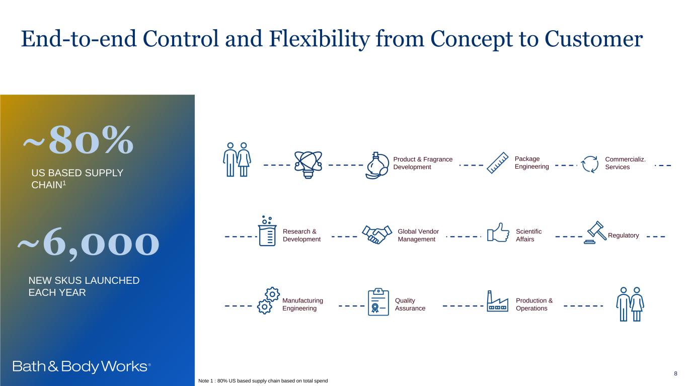 Supply Chain Operations: Integrated Development and Production Engines Innovation, speed at scale, quality and agility fuels BBW’s growth 7 Development Engine Elevate our brand and products by bringing fragrance, formula and packaging newness to life Production Engine Enable a seamless experience by delivering products where and when the customers want them, at optimized cost Integrated with suppliers to execute, drive continuous improvements and build relevant capabilities Enabling capabilities: Strategic Engagement Data & Analytics Operational Excellence Sustainability Synced with extended supply chain and channels
