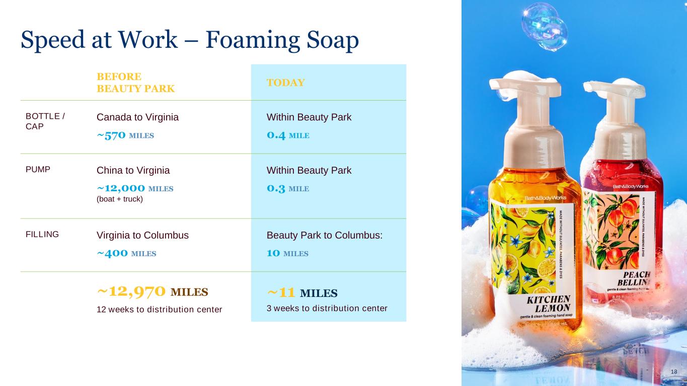 BEFORE BEAUTY PARK TODAY BOTTLE / CAP Canada to Virginia ~570 MILES Within Beauty Park 0.4 MILE PUMP China to Virginia ~12,000 MILES (boat + truck) Within Beauty Park 0.3 MILE FILLING Virginia to Columbus ~400 MILES Beauty Park to Columbus: 10 MILES ~12,970 MILES 12 weeks to distribution center ~11 MILES 3 weeks to distribution center Speed at Work – Foaming Soap 13
