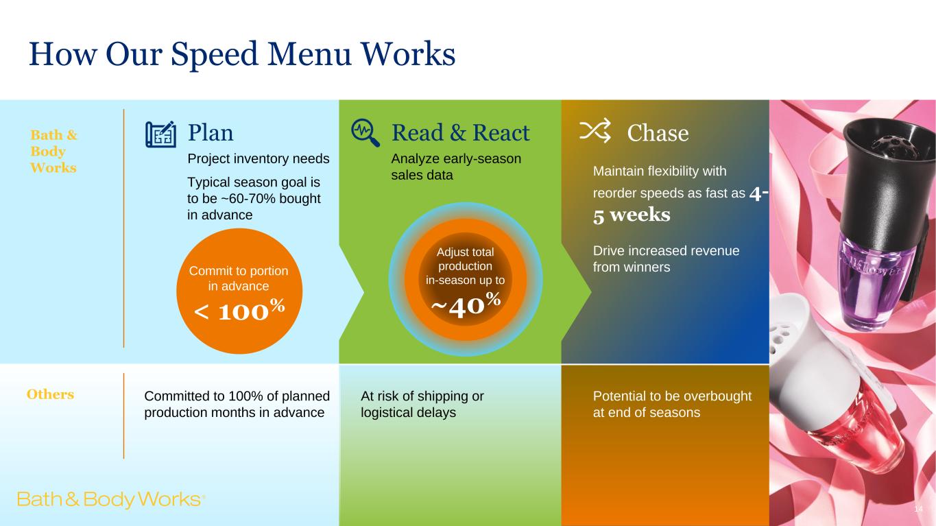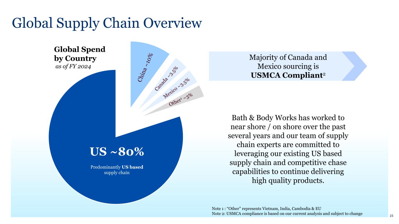How Our Speed Menu Works Read & React Analyze early-season sales data ChasePlan Project inventory needs Maintain flexibility with reorder speeds as fast as 4- 5 weeks Drive increased revenue from winners Commit to portion in advance < 100% Adjust total production in-season up to ~40% Committed to 100% of planned production months in advance Others At risk of shipping or logistical delays Potential to be overbought at end of seasons Bath & Body Works Typical season goal is to be ~60-70% bought in advance 14