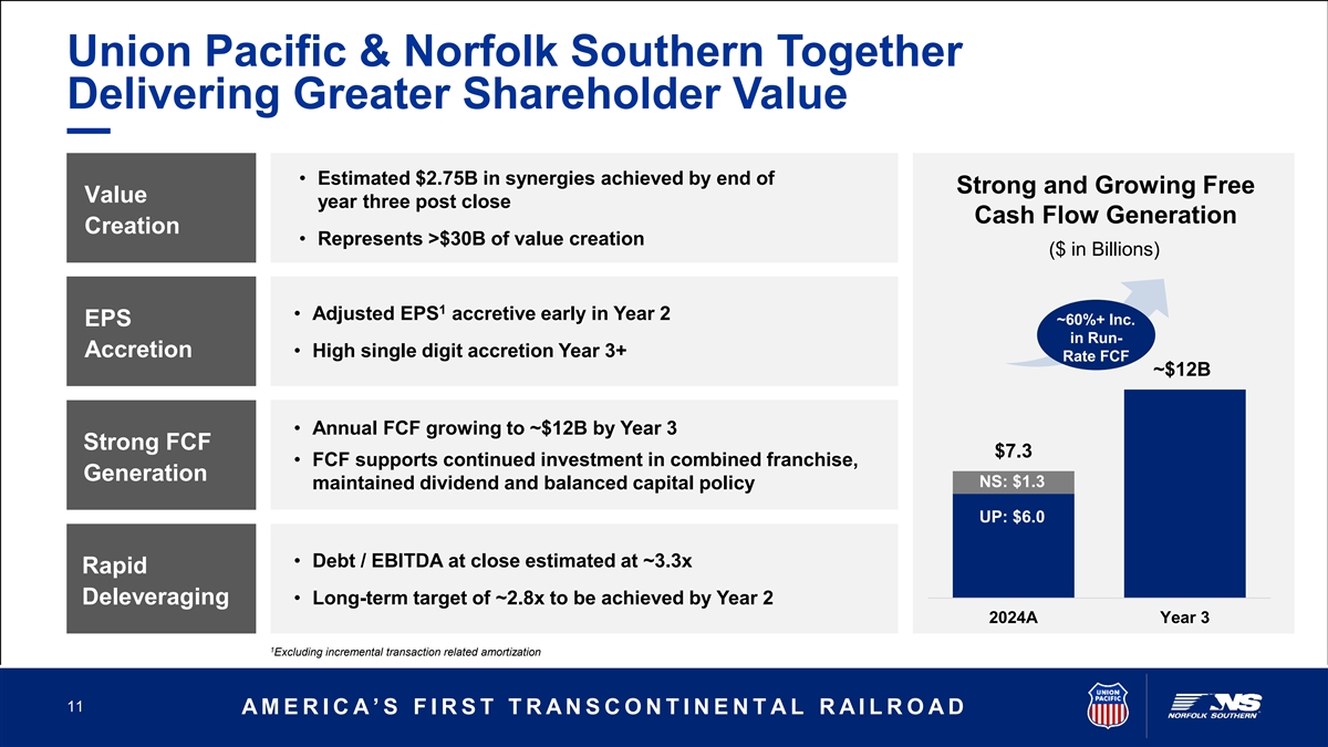 Transcontinental Railroad Unlocks Significant Synergies • Converts U.S. truck volumes to rail through new single- line service $1.75B • Unlocks rail options in markets where rail is currently less efficient by connecting ~100 ports and 10 international gateways, enabling more efficient and cost-effective Revenue supply chains $2.75B Synergies • Further penetrate international markets Annualized Synergy • Improve efficiency and safety from shared best operating Opportunity Within practices and state-of-the-art technology $1.0B Three Years • Reduce purchased services and materials costs • Enhance asset utilization and routing & shop facilities Cost efficiencies Synergies • Rationalize SG&A costs 10 AMERICA’S FIRST TRANSCONTINENTAL RAILROAD