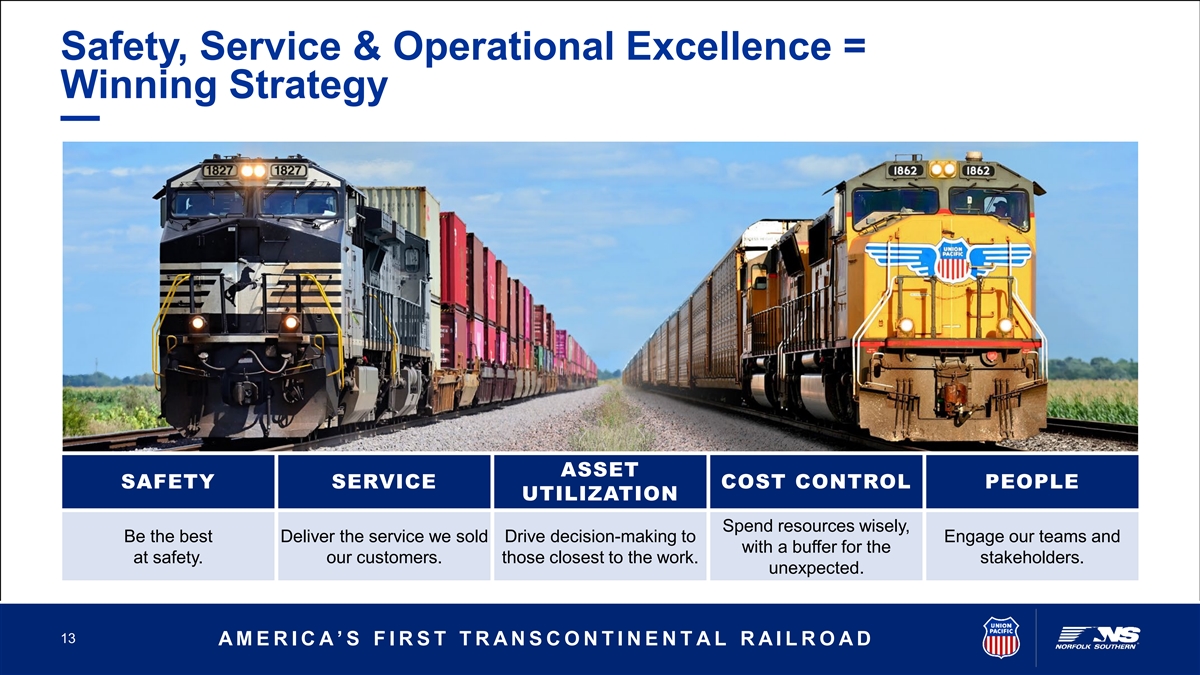 Key Steps to Transaction Completion • Transaction subject to obtaining Surface Transportation Board (“STB”) approval and other applicable regulatory authorities • Transaction subject to approval by Union Pacific and Norfolk Southern shareholders • Up to 6 months to file STB application; 16-month review process • Targeted close by early 2027 • Committed to seamless integration 12 12 AMERICA’S FIRST TRANSCONTINENTAL RAILROAD