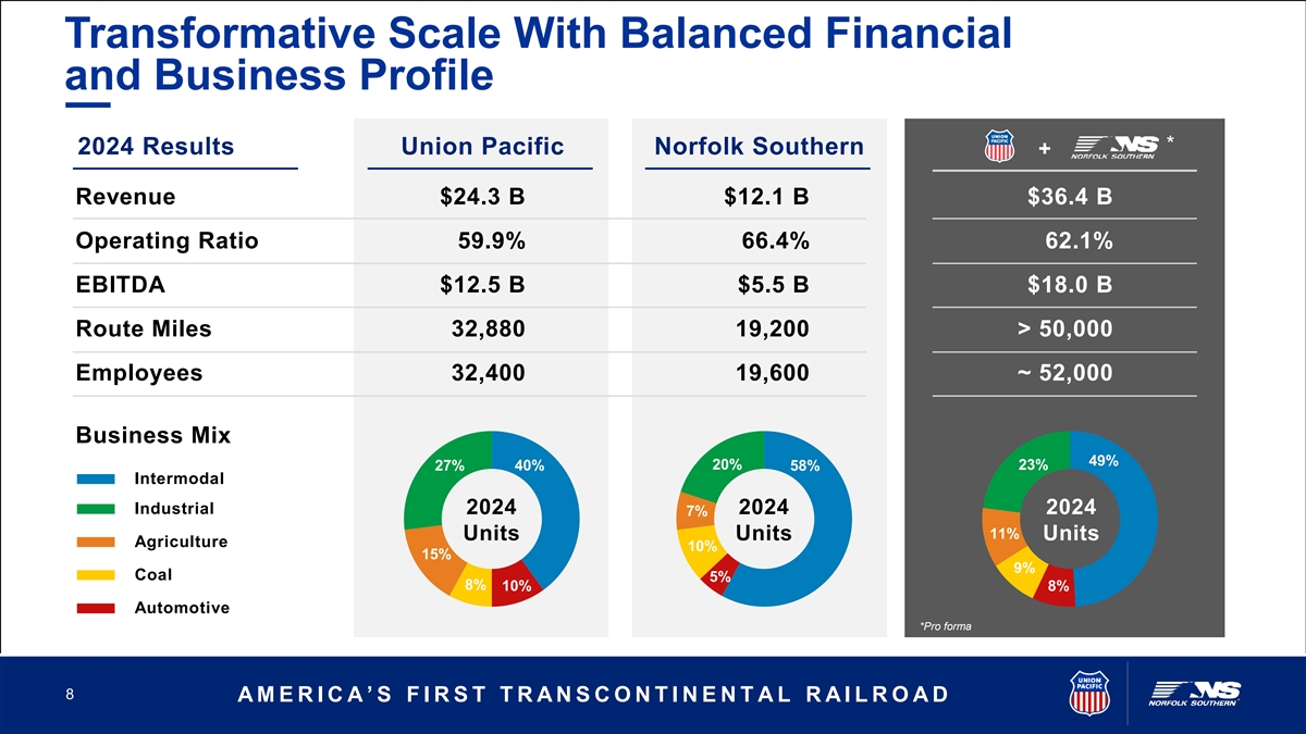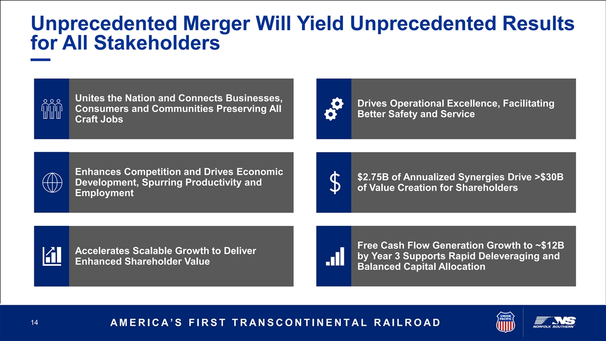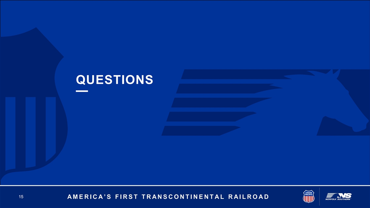 Cautionary Note Regarding Forward Looking Statements Certain statements in this communication are “forward-looking statements” within the meaning of the “safe harbor” provisions of the Private Securities Litigation Reform Act of 1995, as amended. These statements relate to future events or future financial performance and involve known and unknown risks, uncertainties, and other factors that may cause Union Pacific’s, Norfolk Southern’s or the combined company’s actual results, levels of activity, performance, or achievements or those of the railroad industry to be materially different from those expressed or implied by any forward-looking statements. In some cases, forward-looking statements may be identified by the use of words like “may,” “will,” “could,” “would,” “should,” “expect,” “anticipate,” “believe,” “project,” “estimate,” “intend,” “plan,” “pro forma,” or any variations or other comparable terminology. While Union Pacific and Norfolk Southern have based these forward-looking statements on those expectations, assumptions, estimates, beliefs and projections they view as reasonable, such forward- looking statements are only predictions and involve known and unknown risks and uncertainties, many of which involve factors or circumstances that are beyond Union Pacific’s, Norfolk Southern’s or the combined company’s control, including but not limited to, in addition to factors disclosed in Union Pacific’s and Norfolk Southern’s respective filings with the U.S. Securities and Exchange Commission (the “SEC”): the occurrence of any event, change or other circumstance that could give rise to the right of one or both of the parties to terminate the definitive merger agreement between Union Pacific and Norfolk Southern providing for the acquisition of Norfolk Southern by Union Pacific (the “Transaction”); the risk that potential legal proceedings may be instituted against Union Pacific or Norfolk Southern and result in significant costs of defense, indemnification or liability; the possibility that the Transaction does not close when expected or at all because required Surface Transportation Board, shareholder or other approvals and other conditions to closing are not received or satisfied on a timely basis or at all (and the risk that such approvals may result in the imposition of conditions that could adversely affect the combined company or the expected benefits of the Transaction); the risk that the combined company will not realize expected benefits, cost savings, accretion, synergies and/or growth from the Transaction, or that such benefits may take longer to realize or be more costly to achieve than expected, including as a result of changes in, or problems arising from, general economic and market conditions, tariffs, interest and exchange rates, monetary policy, laws and regulations and their enforcement, and the degree of competition in the geographic and business areas in which Union Pacific and Norfolk Southern operate; disruption to the parties’ businesses as a result of the announcement and pendency of the Transaction; the costs associated with the anticipated length of time of the pendency of the Transaction, including the restrictions contained in the definitive merger agreement on the ability of Union Pacific and Norfolk Southern, respectively, to operate their respective businesses outside the ordinary course during the pendency of the Transaction; the diversion of Union Pacific’s and Norfolk Southern’s management’s attention and time from ongoing business operations and opportunities on merger-related matters; the risk that the integration of each party’s operations will be materially delayed or will be more costly or difficult than expected or that the parties are otherwise unable to successfully integrate each party’s businesses into the other’s businesses; the possibility that the Transaction may be more expensive to complete than anticipated, including as a result of unexpected factors or events; reputational risk and potential adverse reactions of Union Pacific’s or Norfolk Southern’s customers, suppliers, employees, labor unions or other business partners, including those resulting from the announcement or completion of the Transaction; the dilution caused by Union Pacific’s issuance of additional shares of its common stock in connection with the consummation of the Transaction; the risk of a downgrade of the credit rating of Union Pacific’s indebtedness, which could give rise to an obligation to redeem existing indebtedness; a material adverse change in the financial condition of Union Pacific, Norfolk Southern or the combined company; changes in domestic or international economic, political or business conditions, including those impacting the transportation industry (including customers, employees and supply chains); Union Pacific’s, Norfolk Southern’s and the combined company’s ability to successfully implement its respective operational, productivity, and strategic initiatives; a significant adverse event on Union Pacific’s or Norfolk Southern’s network, including, but not limited to, a mainline accident, discharge of hazardous materials, or climate-related or other network outage; the outcome of claims, litigation, governmental proceedings and investigations involving Union Pacific or Norfolk Southern, including, in the case of Norfolk Southern, those with respect to the Eastern Ohio incident; the nature and extent of Norfolk Southern’s environmental remediation obligations with respect to the Eastern Ohio incident; new or additional governmental regulation and/or operational changes resulting from or related to the Eastern Ohio incident; and a cybersecurity incident or other disruption to our technology infrastructure. This list of important factors is not intended to be exhaustive. These and other important factors, including those discusse