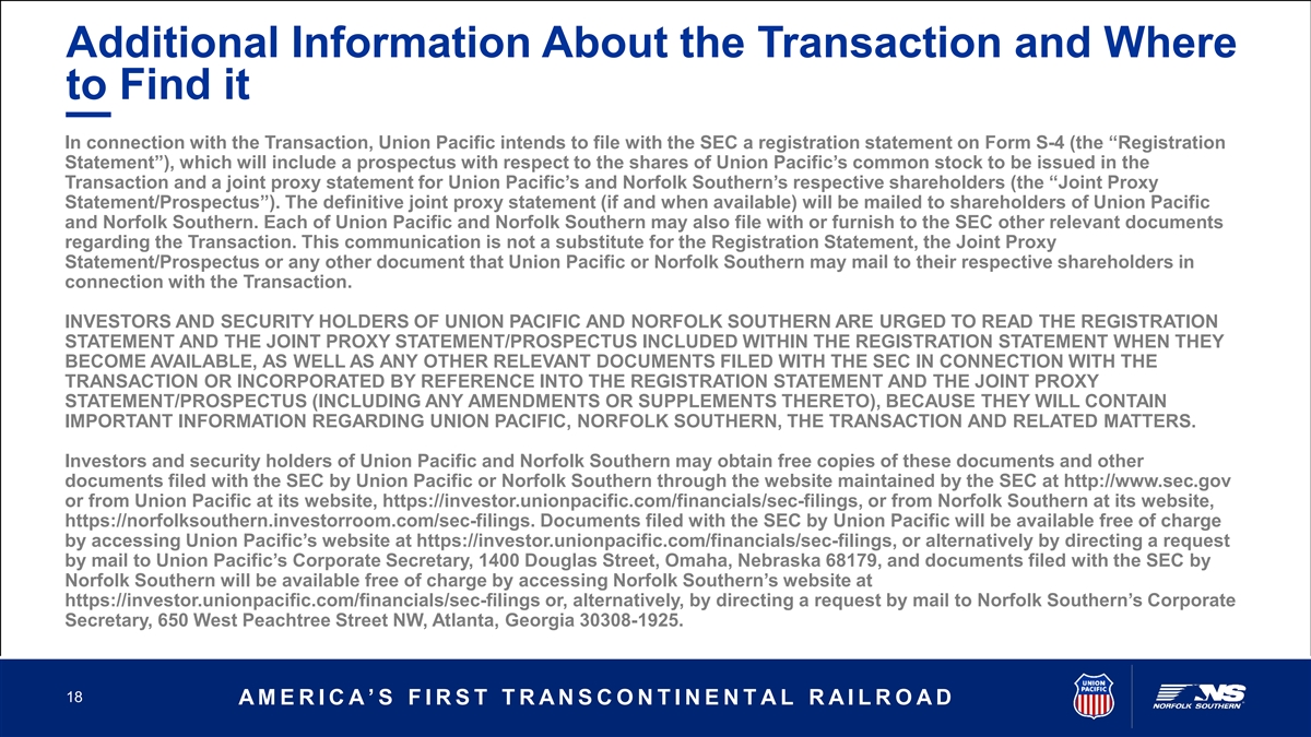 Additional Information About the Transaction and Where to Find it In connection with the Transaction, Union Pacific intends to file with the SEC a registration statement on Form S-4 (the “Registration Statement”), which will include a prospectus with respect to the shares of Union Pacific’s common stock to be issued in the Transaction and a joint proxy statement for Union Pacific’s and Norfolk Southern’s respective shareholders (the “Joint Proxy Statement/Prospectus”). The definitive joint proxy statement (if and when available) will be mailed to shareholders of Union Pacific and Norfolk Southern. Each of Union Pacific and Norfolk Southern may also file with or furnish to the SEC other relevant documents regarding the Transaction. This communication is not a substitute for the Registration Statement, the Joint Proxy Statement/Prospectus or any other document that Union Pacific or Norfolk Southern may mail to their respective shareholders in connection with the Transaction. INVESTORS AND SECURITY HOLDERS OF UNION PACIFIC AND NORFOLK SOUTHERN ARE URGED TO READ THE REGISTRATION STATEMENT AND THE JOINT PROXY STATEMENT/PROSPECTUS INCLUDED WITHIN THE REGISTRATION STATEMENT WHEN THEY BECOME AVAILABLE, AS WELL AS ANY OTHER RELEVANT DOCUMENTS FILED WITH THE SEC IN CONNECTION WITH THE TRANSACTION OR INCORPORATED BY REFERENCE INTO THE REGISTRATION STATEMENT AND THE JOINT PROXY STATEMENT/PROSPECTUS (INCLUDING ANY AMENDMENTS OR SUPPLEMENTS THERETO), BECAUSE THEY WILL CONTAIN IMPORTANT INFORMATION REGARDING UNION PACIFIC, NORFOLK SOUTHERN, THE TRANSACTION AND RELATED MATTERS. Investors and security holders of Union Pacific and Norfolk Southern may obtain free copies of these documents and other documents filed with the SEC by Union Pacific or Norfolk Southern through the website maintained by the SEC at http://www.sec.gov or from Union Pacific at its website, https://investor.unionpacific.com/financials/sec-filings, or from Norfolk Southern at its website, https://norfolksouthern.investorroom.com/sec-filings. Documents filed with the SEC by Union Pacific will be available free of charge by accessing Union Pacific’s website at https://investor.unionpacific.com/financials/sec-filings, or alternatively by directing a request by mail to Union Pacific’s Corporate Secretary, 1400 Douglas Street, Omaha, Nebraska 68179, and documents filed with the SEC by Norfolk Southern will be available free of charge by accessing Norfolk Southern’s website at https://investor.unionpacific.com/financials/sec-filings or, alternatively, by directing a request by mail to Norfolk Southern’s Corporate Secretary, 650 West Peachtree Street NW, Atlanta, Georgia 30308-1925. 18 AMERICA’S FIRST TRANSCONTINENTAL RAILROAD