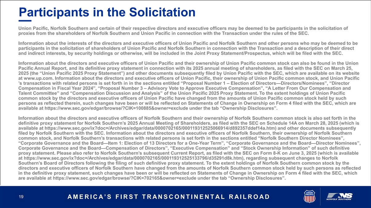 Participants in the Solicitation Union Pacific, Norfolk Southern and certain of their respective directors and executive officers may be deemed to be participants in the solicitation of proxies from the shareholders of Norfolk Southern and Union Pacific in connection with the Transaction under the rules of the SEC. Information about the interests of the directors and executive officers of Union Pacific and Norfolk Southern and other persons who may be deemed to be participants in the solicitation of shareholders of Union Pacific and Norfolk Southern in connection with the Transaction and a description of their direct and indirect interests, by security holdings or otherwise, will be included in the Joint Proxy Statement/Prospectus, which will be filed with the SEC. Information about the directors and executive officers of Union Pacific and their ownership of Union Pacific common stock can also be found in the Union Pacific Annual Report, and its definitive proxy statement in connection with its 2025 annual meeting of shareholders, as filed with the SEC on March 25, 2025 (the “Union Pacific 2025 Proxy Statement”) and other documents subsequently filed by Union Pacific with the SEC, which are available on its website at www.up.com. Information about the directors and executive officers of Union Pacific, their ownership of Union Pacific common stock, and Union Pacific ’s transactions with related persons is set forth in in the sections entitled “Proposal Number 1 – Election of Directors—Directors/Nominees”, “Director Compensation in Fiscal Year 2024”, “Proposal Number 3 – Advisory Vote to Approve Executive Compensation”, “A Letter From Our Compensation and Talent Committee” and “Compensation Discussion and Analysis” of the Union Pacific 2025 Proxy Statement. To the extent holdings of Union Pacific common stock by the directors and executive officers of Union Pacific have changed from the amounts of Union Pacific common stock held by such persons as reflected therein, such changes have been or will be reflected on Statements of Change in Ownership on Form 4 filed with the SEC, which are available at https://www.sec.gov/edgar/browse/?CIK=100885&owner=exclude under the tab “Ownership Disclosures”. Information about the directors and executive officers of Norfolk Southern and their ownership of Norfolk Southern common stock is also set forth in the definitive proxy statement for Norfolk Southern’s 2025 Annual Meeting of Shareholders, as filed with the SEC on Schedule 14A on March 28, 2025 (which is available at https://www.sec.gov/ix?doc=/Archives/edgar/data/0000702165/000119312525066914/d892357ddef14a.htm) and other documents subsequently filed by Norfolk Southern with the SEC. Information about the directors and executive officers of Norfolk Southern, their ownership of Norfolk Southern common stock, and Norfolk Southern’s transactions with related persons is set forth in the sections entitled “Norfolk Southern Director Nominees”, “Corporate Governance and the Board—Item 1: Election of 13 Directors for a One-Year Term”, “Corporate Governance and the Board—Director Nominees”, Corporate Governance and the Board—Compensation of Directors”, “Executive Compensation” and “Stock Ownership Information” of such definitive proxy statement. Please also refer to Norfolk Southern’s subsequent Current Report, as filed with the SEC on Form 8-K on June 3, 2025 (which is available at https://www.sec.gov/ix?doc=/Archives/edgar/data/0000702165/000119312525133796/d35291d8k.htm), regarding subsequent changes to Norfolk Southern’s Board of Directors following the filing of such definitive proxy statement. To the extent holdings of Norfolk Southern common stock by the directors and executive officers of Norfolk Southern have changed from the amounts of Norfolk Southern common stock held by such persons as reflected in the definitive proxy statement, such changes have been or will be reflected on Statements of Change in Ownership on Form 4 filed with the SEC, which are available at https://www.sec.gov/edgar/browse/?CIK=702165&owner=exclude under the tab “Ownership Disclosures”. 19 AMERICA’S FIRST TRANSCONTINENTAL RAILROAD