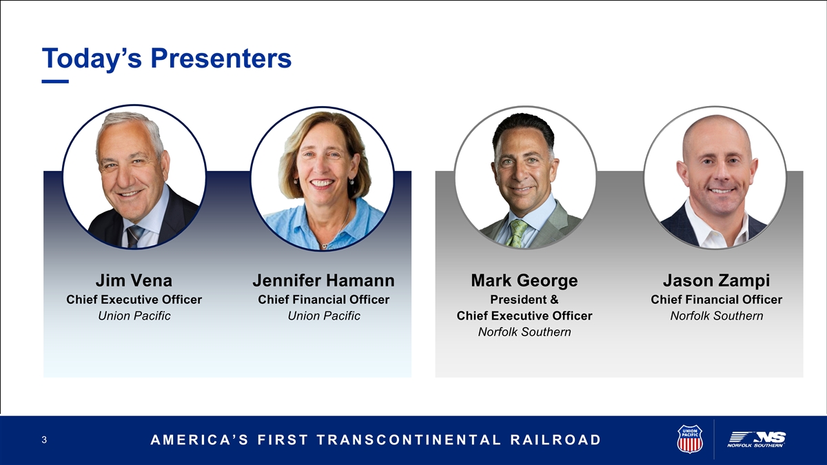 Cautionary Information This presentation and related materials contain statements that are forward looking statements. Forward-looking statements should not be read as a guarantee of future performance or results, and will not necessarily be accurate indications of the times that, or by which, such performance or results will be achieved. Forward-looking information, including expectations regarding operational and financial improvements and future performance or results are subject to risks and uncertainties that could cause actual performance or results to differ materially from those expressed in the statement. Important factors, including risk factors, could affect future results and could cause those results or other outcomes to differ materially from those expressed or implied in the forward-looking statements. Information regarding risk factors and other cautionary information are available in Annual Report on Form 10-K for 2024, which was filed with the SEC on February 7, 2025 and Norfolk Southern’s Annual Report on Form 10-K, which was filed with the SEC on February 10, 2025. Each Company updates information regarding risk factors if circumstances require such updates in its periodic reports on Form 10-Q and its subsequent Annual Reports on Form 10-K (or such other reports that may be filed with the SEC). Forward-looking statements speak only as of, and are based only upon information available on, the date the statements were made. Neither company assumes any obligation to update forward-looking information to reflect actual results, changes in assumptions or changes in other factors affecting forward-looking information. If an update is made, no inference should be drawn that additional updates will be made with respect thereto or with respect to other forward-looking statements. References to Union Pacific’s or Norfolk Southern’s website are provided for convenience and, therefore, information on or available through the website is not, and should not be deemed to be, incorporated by reference herein. This is not an offer or solicitation. For additional information please reference slides 16, 17, 18 & 19. 2 AMERICA’S FIRST TRANSCONTINENTAL RAILROAD