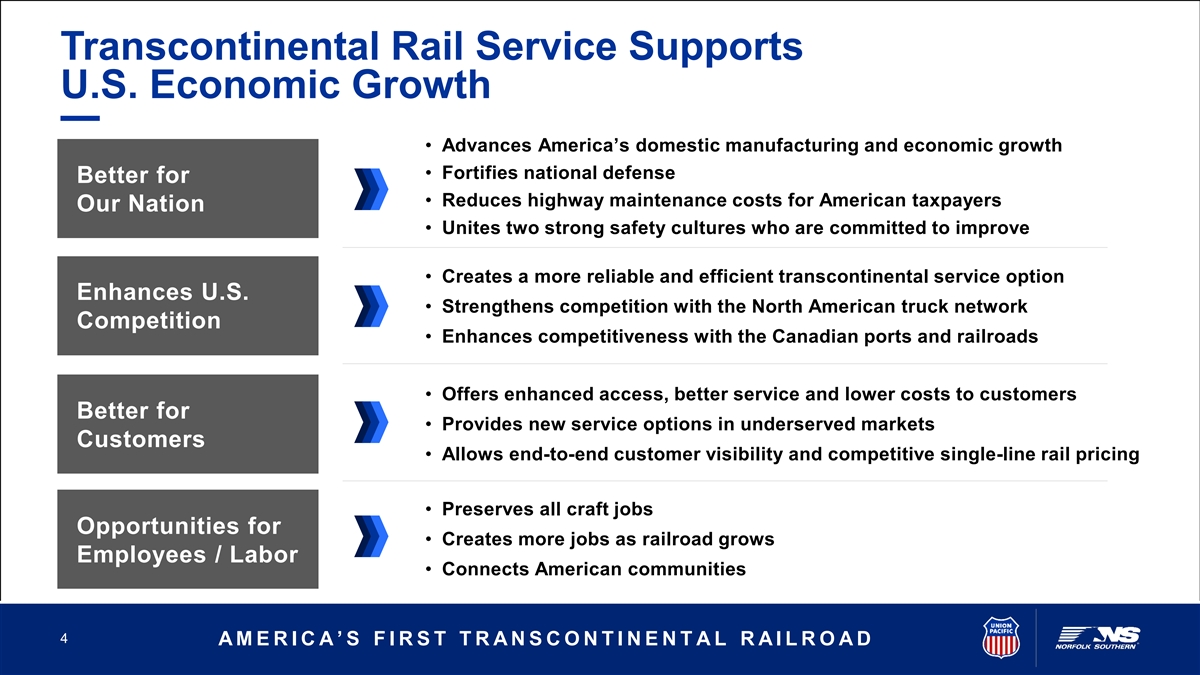 Today’s Presenters Jim Vena Jennifer Hamann Mark George Jason Zampi Chief Executive Officer Chief Financial Officer President & Chief Financial Officer Union Pacific Union Pacific Chief Executive Officer Norfolk Southern Norfolk Southern 3 AMERICA’S FIRST TRANSCONTINENTAL RAILROAD