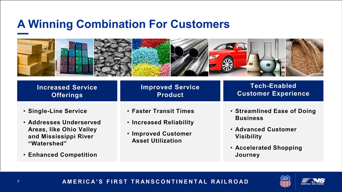 Enhancing Competition & Supporting Growth Creation of New Single-Line Routes Provides Greater Efficiency and Benefits All Stakeholders Single Line Service & New Markets Major Ports & International Gateways Union Pacific Union Pacific Norfolk Southern Norfolk Southern Unlocks Mississippi River Connects U.S manufacturing 1-2 day faster cross-country solution, making rail more competitive with truck “Watershed” options to the world 6 AMERICA’S FIRST TRANSCONTINENTAL RAILROAD
