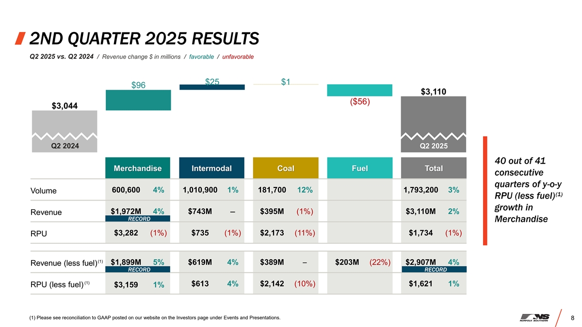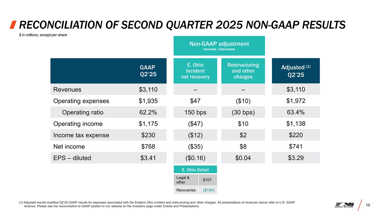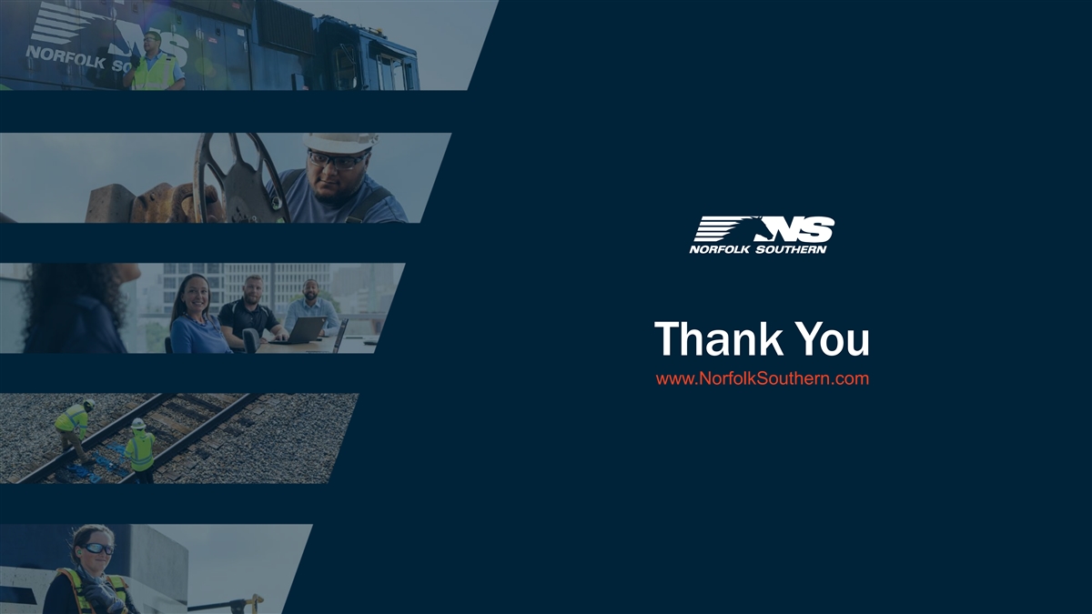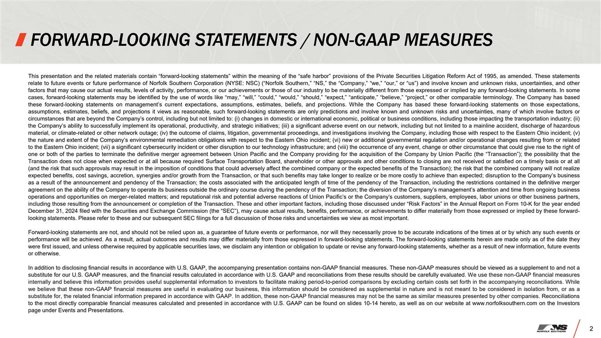FORWARD-LOOKING STATEMENTS / NON-GAAP MEASURES This presentation and the related materials contain “forward-looking statements” within the meaning of the “safe harbor” provisions of the Private Securities Litigation Reform Act of 1995, as amended. These statements relate to future events or future performance of Norfolk Southern Corporation (NYSE: NSC) (“Norfolk Southern,” “NS,” the “Company,” “we,” “our,” or “us”) and involve known and unknown risks, uncertainties, and other factors that may cause our actual results, levels of activity, performance, or our achievements or those of our industry to be materially different from those expressed or implied by any forward-looking statements. In some cases, forward-looking statements may be identified by the use of words like “may,” “will,” “could,” “would,” “should,” “expect,” “anticipate,” “believe,” “project,” or other comparable terminology. The Company has based these forward-looking statements on management’s current expectations, assumptions, estimates, beliefs, and projections. While the Company has based these forward-looking statements on those expectations, assumptions, estimates, beliefs, and projections it views as reasonable, such forward-looking statements are only predictions and involve known and unknown risks and uncertainties, many of which involve factors or circumstances that are beyond the Company’s control, including but not limited to: (i) changes in domestic or international economic, political or business conditions, including those impacting the transportation industry; (ii) the Company’s ability to successfully implement its operational, productivity, and strategic initiatives; (iii) a significant adverse event on our network, including but not limited to a mainline accident, discharge of hazardous material, or climate-related or other network outage; (iv) the outcome of claims, litigation, governmental proceedings, and investigations involving the Company, including those with respect to the Eastern Ohio incident; (v) the nature and extent of the Company’s environmental remediation obligations with respect to the Eastern Ohio incident; (vi) new or additional governmental regulation and/or operational changes resulting from or related to the Eastern Ohio incident; (vii) a significant cybersecurity incident or other disruption to our technology infrastructure; and (viii) the occurrence of any event, change or other circumstance that could give rise to the right of one or both of the parties to terminate the definitive merger agreement between Union Pacific and the Company providing for the acquisition of the Company by Union Pacific (the “Transaction”); the possibility that the Transaction does not close when expected or at all because required Surface Transportation Board, shareholder or other approvals and other conditions to closing are not received or satisfied on a timely basis or at all (and the risk that such approvals may result in the imposition of conditions that could adversely affect the combined company or the expected benefits of the Transaction); the risk that the combined company will not realize expected benefits, cost savings, accretion, synergies and/or growth from the Transaction, or that such benefits may take longer to realize or be more costly to achieve than expected; disruption to the Company’s business as a result of the announcement and pendency of the Transaction; the costs associated with the anticipated length of time of the pendency of the Transaction, including the restrictions contained in the definitive merger agreement on the ability of the Company to operate its business outside the ordinary course during the pendency of the Transaction; the diversion of the Company’s management’s attention and time from ongoing business operations and opportunities on merger-related matters; and reputational risk and potential adverse reactions of Union Pacific’s or the Company’s customers, suppliers, employees, labor unions or other business partners, including those resulting from the announcement or completion of the Transaction. These and other important factors, including those discussed under “Risk Factors” in the Annual Report on Form 10-K for the year ended December 31, 2024 filed with the Securities and Exchange Commission (the “SEC”), may cause actual results, benefits, performance, or achievements to differ materially from those expressed or implied by these forward- looking statements. Please refer to these and our subsequent SEC filings for a full discussion of those risks and uncertainties we view as most important. Forward-looking statements are not, and should not be relied upon as, a guarantee of future events or performance, nor will they necessarily prove to be accurate indications of the times at or by which any such events or performance will be achieved. As a result, actual outcomes and results may differ materially from those expressed in forward-looking statements. The forward-looking statements herein are made only as of the date they were first issued, and unless otherwise required by applicable securities laws, we disclaim any intention or obligation to update or revise any forward-looking statements, whether as a result of new information, future events or otherwise. In addition to disclosing financial results in accordance with U.S. GAAP, the accompanying presentation contains non-GAAP financial measures. These non-GAAP measures should be viewed as a supplement to and not a substitute for our U.S. GAAP measures, and the financial results calculated in accordance with U.S. GAAP and reconciliations from these results should be carefully evaluated. We use these non-GAAP financial measures internally and believe this information provides useful supplemental information to investors to facilitate making period-to-period comparisons by excluding certain costs set forth in the ac