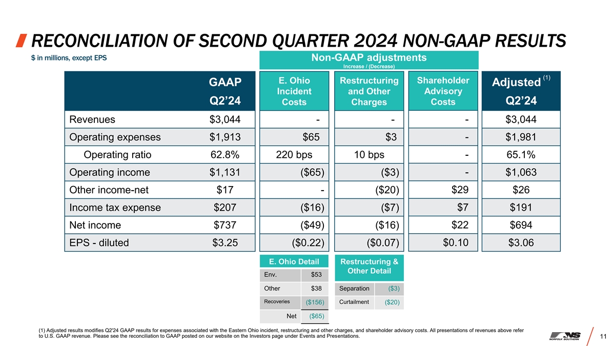 RECONCILIATION OF SECOND QUARTER 2025 NON-GAAP RESULTS $ in millions, except per share Non-GAAP adjustment Increase / (Decrease) E. Ohio Restructuring (1) GAAP Adjusted Incident and other Q2’25 Q2’25 net recovery charges $3,110 Revenues $3,110 – – Operating expenses $1,935 $47 ($10) $1,972 Operating ratio 62.2% 150 bps (30 bps) 63.4% Operating income $1,175 ($47) $10 $1,138 Income tax expense $230 ($12) $2 $220 $741 Net income $768 ($35) $8 EPS – diluted $3.41 ($0.16) $0.04 $3.29 E. Ohio Detail Legal & $107 other Recoveries ($154) (1) Adjusted results modifies Q2’25 GAAP results for expenses associated with the Eastern Ohio incident and restructuring and other charges. All presentations of revenues above refer to U.S. GAAP (1) Adjusted results modifies Q4’23 GAAP results for expenses associated with the Eastern Ohio incident. All presentations of revenues above refer to U.S. GAAP revenue. 10 revenue. Please see the reconciliation to GAAP posted on our website on the Investors page under Events and Presentations. Please see reconciliation to GAAP posted on our website on the Investors page under Events and Presentations for this event.