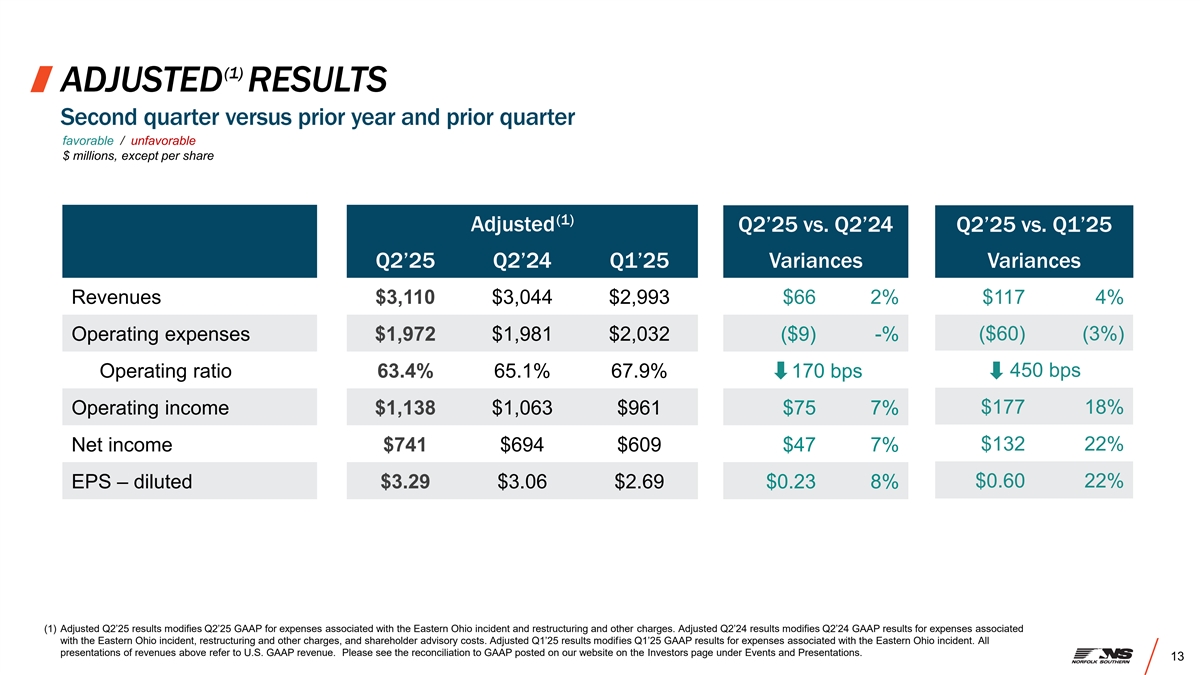 RECONCILIATION OF FIRST QUARTER 2025 NON-GAAP RESULTS $ in millions, except per share Non-GAAP adjustment Increase / (Decrease) E. Ohio (1) GAAP Adjusted Incident Q1’25 Q1’25 net recovery Revenues $2,993 – $2,993 Operating expenses $1,847 $185 $2,032 Operating ratio 61.7% 620 bps 67.9% Operating income $1,146 ($185) $961 Income tax expense $228 ($44) $184 Net income $750 ($141) $609 EPS – diluted $3.31 ($0.62) $2.69 E. Ohio Detail Legal & $39 other Recoveries ($224) (1) Adjusted results modifies Q1’25 GAAP results for expenses associated with the Eastern Ohio incident. All presentations of revenues above refer to U.S. GAAP revenue. Please see the reconciliation to GAAP (1) Adjusted results modifies Q4’23 GAAP results for expenses associated with the Eastern Ohio incident. All presentations of revenues above refer to U.S. GAAP revenue. 12 posted on our website on the Investors page under Events and Presentations. Please see reconciliation to GAAP posted on our website on the Investors page under Events and Presentations for this event.
