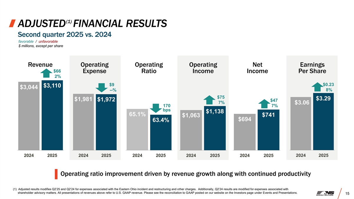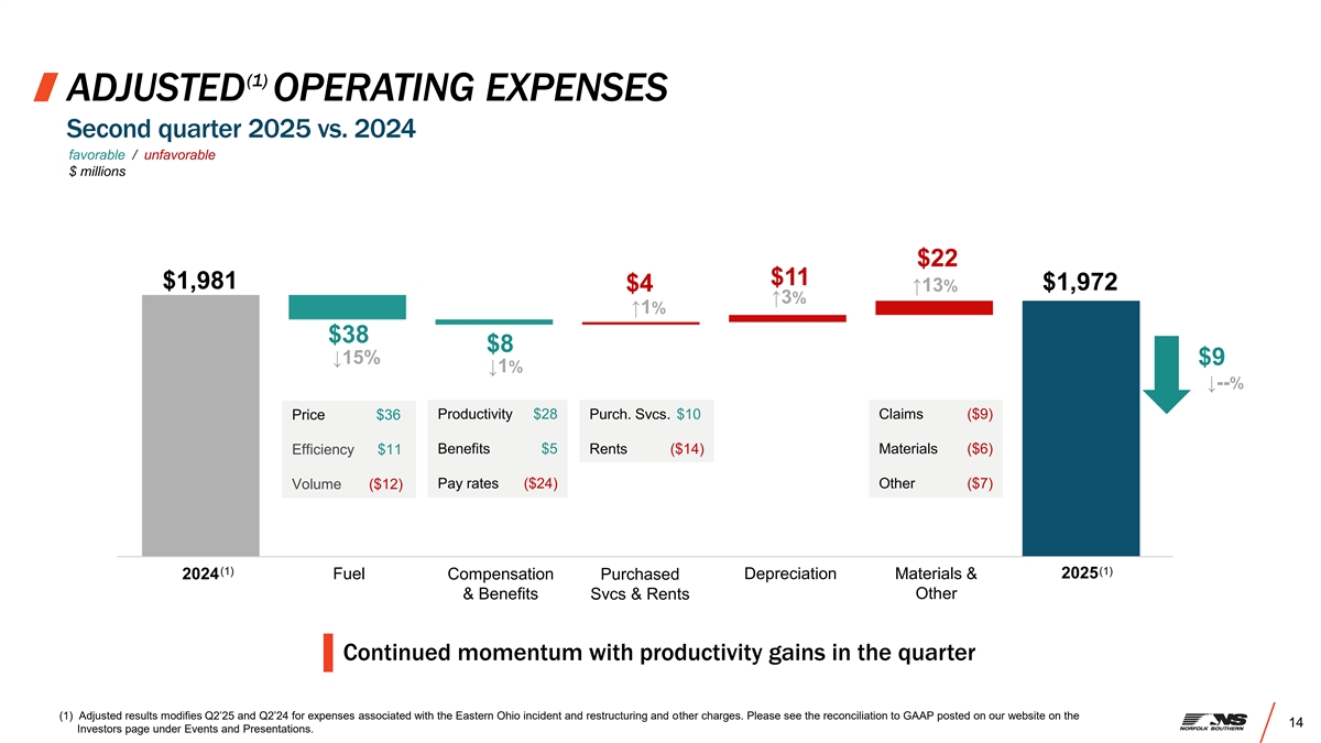 (1) ADJUSTED RESULTS Second quarter versus prior year and prior quarter favorable / unfavorable $ millions, except per share (1) Adjusted Q2’25 vs. Q2’24 Q2’25 vs. Q1’25 Q2’25 Q2’24 Q1’25 Variances Variances Revenues $3,110 $3,044 $2,993 $66 2% $117 4% ($60) (3%) Operating expenses $1,972 $1,981 $2,032 ($9) -% Operating ratio 63.4% 65.1% 67.9% 170 bps 450 bps $177 18% Operating income $1,138 $1,063 $961 $75 7% Net income $741 $694 $609 $47 7% $132 22% $0.60 22% EPS – diluted $3.29 $3.06 $2.69 $0.23 8% (1) Adjusted Q2’25 results modifies Q2’25 GAAP for expenses associated with the Eastern Ohio incident and restructuring and other charges. Adjusted Q2’24 results modifies Q2’24 GAAP results for expenses associated with the Eastern Ohio incident, restructuring and other charges, and shareholder advisory costs. Adjusted Q1’25 results modifies Q1’25 GAAP results for expenses associated with the Eastern Ohio incident. All presentations of revenues above refer to U.S. GAAP revenue. Please see the reconciliation to GAAP posted on our website on the Investors page under Events and Presentations. 13