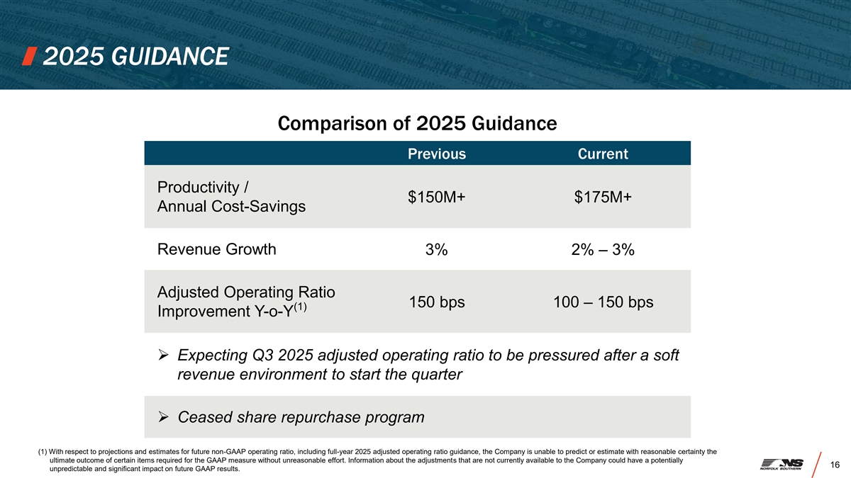 (1) ADJUSTED FINANCIAL RESULTS Second quarter 2025 vs. 2024 favorable / unfavorable $ millions, except per share Revenue Operating Operating Operating Net Earnings $66 Expense Ratio Income Income Per Share 2% $9 $0.23 $3,110 $3,044 --% 8% $75 $3.29 $1,981 $1,972 $47 7% $3.06 170 7% bps $1,138 65.1% $741 $1,063 $694 63.4% 2024 2025 2024 2025 2024 2025 2024 2025 2024 2025 2024 2025 Operating ratio improvem 1 ent driven by revenue growth along with continued productivity 1 1 (1) Reflects Adjusted 2024 and 2023 results for Operating Expense, Operating Ratio, Operating Income, Net Income, and Earnings Per Share by modifying GAAP results for the Eastern Ohio incident, (1) Adjusted results modifies Q2’25 and Q2’24 for expenses associated with the Eastern Ohio incident and restructuring and other charges. Additionally, Q2’24 results are modified for expenses associated with restructuring and other charges, gains on railway line transactions, shareholder advisory costs, and a deferred tax adjustment. All presentations of revenues above refer to U.S. GAAP revenue. Please shareholder advisory matters. All presentations of revenues above refer to U.S. GAAP revenue. Please see the reconciliation to GAAP posted on our website on the Investors page under Events and Presentations. 15 see reconciliation to GAAP posted on our website on the Investors page under Events and Presentations for this event.