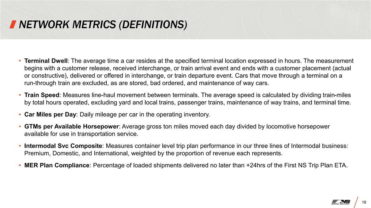NETWORK METRICS (DEFINITIONS) • Terminal Dwell: The average time a car resides at the specified terminal location expressed in hours. The measurement begins with a customer release, received interchange, or train arrival event and ends with a customer placement (actual or constructive), delivered or offered in interchange, or train departure event. Cars that move through a terminal on a run-through train are excluded, as are stored, bad ordered, and maintenance of way cars. • Train Speed: Measures line-haul movement between terminals. The average speed is calculated by dividing train-miles by total hours operated, excluding yard and local trains, passenger trains, maintenance of way trains, and terminal time. • Car Miles per Day: Daily mileage per car in the operating inventory. • GTMs per Available Horsepower: Average gross ton miles moved each day divided by locomotive horsepower available for use in transportation service. • Intermodal Svc Composite: Measures container level trip plan performance in our three lines of Intermodal business: Premium, Domestic, and International, weighted by the proportion of revenue each represents. • MER Plan Compliance: Percentage of loaded shipments delivered no later than +24hrs of the First NS Trip Plan ETA. 19