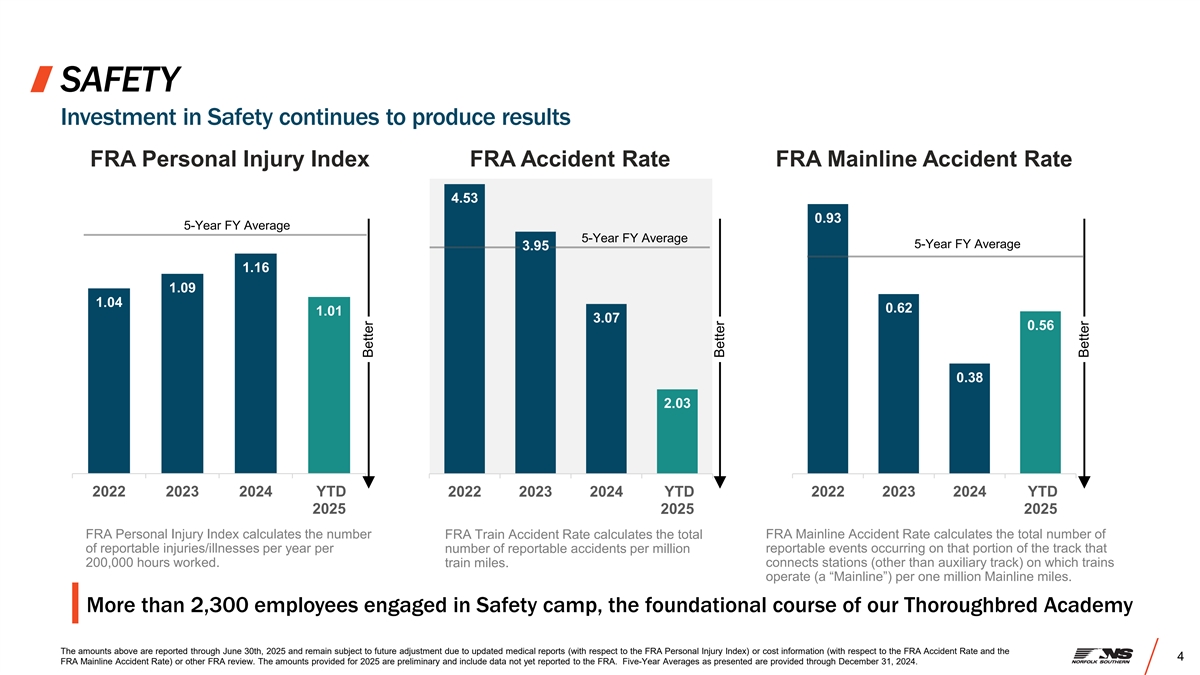 SAFETY Investment in Safety continues to produce results FRA Personal Injury Index FRA Accident Rate FRA Mainline Accident Rate 4.53 0.93 5-Year FY Average 5-Year FY Average 5-Year FY Average 3.95 1.16 1.09 1.04 0.62 1.01 3.07 0.56 0.38 2.03 2022 2023 2024 YTD 2022 2023 2024 YTD 2022 2023 2024 YTD 2025 2025 2025 FRA Personal Injury Index calculates the number FRA Train Accident Rate calculates the total FRA Mainline Accident Rate calculates the total number of of reportable injuries/illnesses per year per reportable events occurring on that portion of the track that number of reportable accidents per million 200,000 hours worked. train miles. connects stations (other than auxiliary track) on which trains operate (a “Mainline”) per one million Mainline miles. More than 2,300 employees engaged in Safety camp, the foundational course of our Thoroughbred Academy The amounts above are reported through June 30th, 2025 and remain subject to future adjustment due to updated medical reports (with respect to the FRA Personal Injury Index) or cost information (with respect to the FRA Accident Rate and the 4 FRA Mainline Accident Rate) or other FRA review. The amounts provided for 2025 are preliminary and include data not yet reported to the FRA. Five-Year Averages as presented are provided through December 31, 2024. Better Better Better