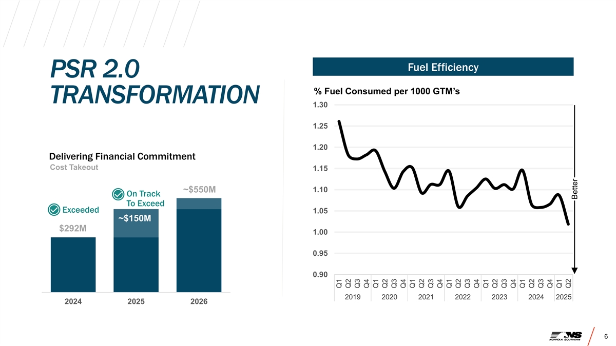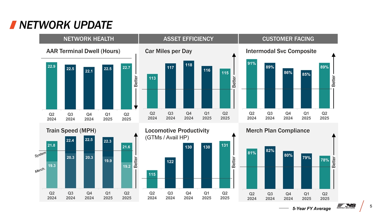 NETWORK UPDATE NETWORK HEALTH ASSET EFFICIENCY CUSTOMER FACING AAR Terminal Dwell (Hours) Car Miles per Day Intermodal Svc Composite 91% 118 22.9 89% 89% 22.7 117 22.5 22.5 116 22.1 115 86% 85% 113 Q2 Q3 Q4 Q1 Q2 Q2 Q3 Q4 Q1 Q2 Q2 Q3 Q4 Q1 Q2 2024 2024 2024 2025 2025 2024 2024 2024 2025 2025 2024 2024 2024 2025 2025 Train Speed (MPH) Locomotive Productivity Merch Plan Compliance (GTMs / Avail HP) 22.5 22.4 22.3 21.8 131 21.6 130 130 82% 81% 80% 20.3 20.3 79% 78% 19.9 122 19.3 19.2 115 Q2 Q3 Q4 Q1 Q2 Q2 Q3 Q4 Q1 Q2 Q2 Q3 Q4 Q1 Q2 2024 2024 2024 2025 2025 2024 2024 2024 2025 2025 2024 2024 2024 2025 2025 5 5-Year FY Average Better Better Better Better Better Better