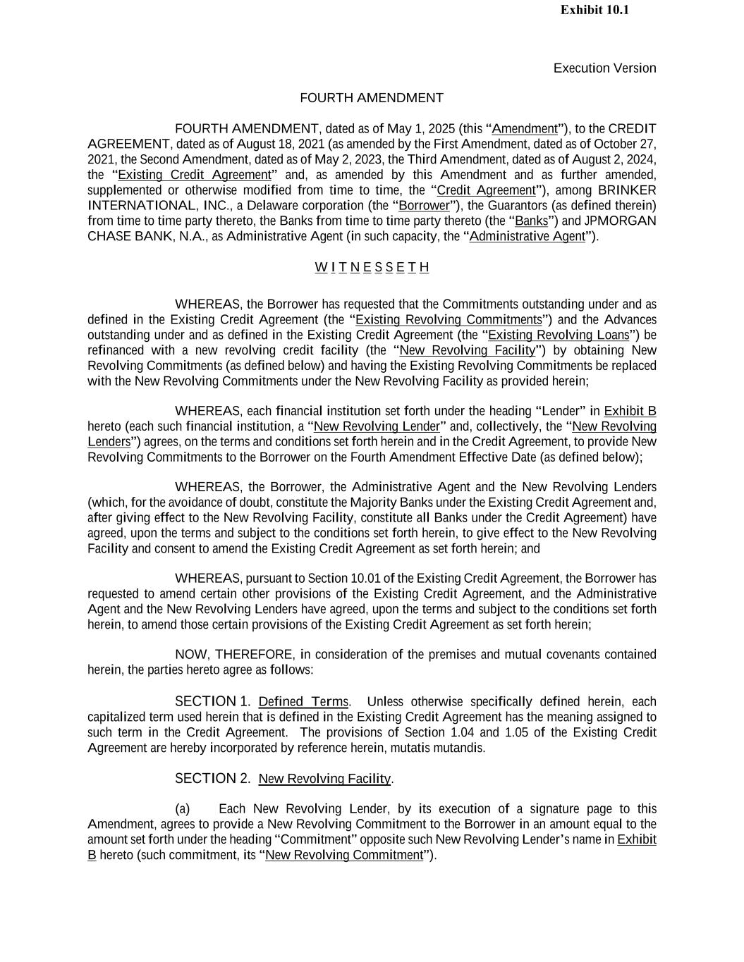 Execution Version FOURTH AMENDMENT FOURTH AMENDMENT, dated as of May 1, 2025 (this “Amendment”), to the CREDIT AGREEMENT, dated as of August 18, 2021 (as amended by the First Amendment, dated as of October 27, 2021, the Second Amendment, dated as of May 2, 2023, the Third Amendment, dated as of August 2, 2024, the “Existing Credit Agreement” and, as amended by this Amendment and as further amended, supplemented or otherwise modified from time to time, the “Credit Agreement”), among BRINKER INTERNATIONAL, INC., a Delaware corporation (the “Borrower”), the Guarantors (as defined therein) from time to time party thereto, the Banks from time to time party thereto (the “Banks”) and JPMORGAN CHASE BANK, N.A., as Administrative Agent (in such capacity, the “Administrative Agent”). W I T N E S S E T H WHEREAS, the Borrower has requested that the Commitments outstanding under and as defined in the Existing Credit Agreement (the “Existing Revolving Commitments”) and the Advances outstanding under and as defined in the Existing Credit Agreement (the “Existing Revolving Loans”) be refinanced with a new revolving credit facility (the “New Revolving Facility”) by obtaining New Revolving Commitments (as defined below) and having the Existing Revolving Commitments be replaced with the New Revolving Commitments under the New Revolving Facility as provided herein; WHEREAS, each financial institution set forth under the heading “Lender” in Exhibit B hereto (each such financial institution, a “New Revolving Lender” and, collectively, the “New Revolving Lenders”) agrees, on the terms and conditions set forth herein and in the Credit Agreement, to provide New Revolving Commitments to the Borrower on the Fourth Amendment Effective Date (as defined below); WHEREAS, the Borrower, the Administrative Agent and the New Revolving Lenders (which, for the avoidance of doubt, constitute the Majority Banks under the Existing Credit Agreement and, after giving effect to the New Revolving Facility, constitute all Banks under the Credit Agreement) have agreed, upon the terms and subject to the conditions set forth herein, to give effect to the New Revolving Facility and consent to amend the Existing Credit Agreement as set forth herein; and WHEREAS, pursuant to Section 10.01 of the Existing Credit Agreement, the Borrower has requested to amend certain other provisions of the Existing Credit Agreement, and the Administrative Agent and the New Revolving Lenders have agreed, upon the terms and subject to the conditions set forth herein, to amend those certain provisions of the Existing Credit Agreement as set forth herein; NOW, THEREFORE, in consideration of the premises and mutual covenants contained herein, the parties hereto agree as follows: SECTION 1. Defined Terms. Unless otherwise specifically defined herein, each capitalized term used herein that is defined in the Existing Credit Agreement has the meaning assigned to such term in the Credit Agreement. The provisions of Section 1.04 and 1.05 of the Existing Credit Agreement are hereby incorporated by reference herein, mutatis mutandis. SECTION 2. New Revolving Facility. (a) Each New Revolving Lender, by its execution of a signature page to this Amendment, agrees to provide a New Revolving Commitment to the Borrower in an amount equal to the amount set forth under the heading “Commitment” opposite such New Revolving Lender’s name in Exhibit B hereto (such commitment, its “New Revolving Commitment”). Exhibit 10.1