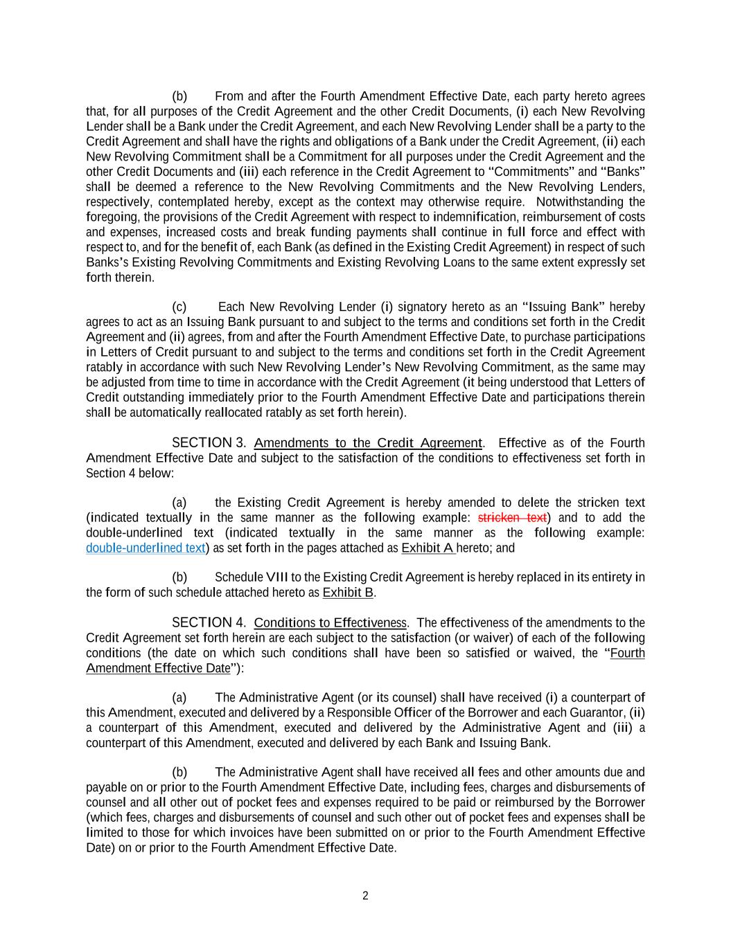 2 (b) From and after the Fourth Amendment Effective Date, each party hereto agrees that, for all purposes of the Credit Agreement and the other Credit Documents, (i) each New Revolving Lender shall be a Bank under the Credit Agreement, and each New Revolving Lender shall be a party to the Credit Agreement and shall have the rights and obligations of a Bank under the Credit Agreement, (ii) each New Revolving Commitment shall be a Commitment for all purposes under the Credit Agreement and the other Credit Documents and (iii) each reference in the Credit Agreement to “Commitments” and “Banks” shall be deemed a reference to the New Revolving Commitments and the New Revolving Lenders, respectively, contemplated hereby, except as the context may otherwise require. Notwithstanding the foregoing, the provisions of the Credit Agreement with respect to indemnification, reimbursement of costs and expenses, increased costs and break funding payments shall continue in full force and effect with respect to, and for the benefit of, each Bank (as defined in the Existing Credit Agreement) in respect of such Banks’s Existing Revolving Commitments and Existing Revolving Loans to the same extent expressly set forth therein. (c) Each New Revolving Lender (i) signatory hereto as an “Issuing Bank” hereby agrees to act as an Issuing Bank pursuant to and subject to the terms and conditions set forth in the Credit Agreement and (ii) agrees, from and after the Fourth Amendment Effective Date, to purchase participations in Letters of Credit pursuant to and subject to the terms and conditions set forth in the Credit Agreement ratably in accordance with such New Revolving Lender’s New Revolving Commitment, as the same may be adjusted from time to time in accordance with the Credit Agreement (it being understood that Letters of Credit outstanding immediately prior to the Fourth Amendment Effective Date and participations therein shall be automatically reallocated ratably as set forth herein). SECTION 3. Amendments to the Credit Agreement. Effective as of the Fourth Amendment Effective Date and subject to the satisfaction of the conditions to effectiveness set forth in Section 4 below: (a) the Existing Credit Agreement is hereby amended to delete the stricken text (indicated textually in the same manner as the following example: stricken text) and to add the double-underlined text (indicated textually in the same manner as the following example: double-underlined text) as set forth in the pages attached as Exhibit A hereto; and (b) Schedule VIII to the Existing Credit Agreement is hereby replaced in its entirety in the form of such schedule attached hereto as Exhibit B. SECTION 4. Conditions to Effectiveness. The effectiveness of the amendments to the Credit Agreement set forth herein are each subject to the satisfaction (or waiver) of each of the following conditions (the date on which such conditions shall have been so satisfied or waived, the “Fourth Amendment Effective Date”): (a) The Administrative Agent (or its counsel) shall have received (i) a counterpart of this Amendment, executed and delivered by a Responsible Officer of the Borrower and each Guarantor, (ii) a counterpart of this Amendment, executed and delivered by the Administrative Agent and (iii) a counterpart of this Amendment, executed and delivered by each Bank and Issuing Bank. (b) The Administrative Agent shall have received all fees and other amounts due and payable on or prior to the Fourth Amendment Effective Date, including fees, charges and disbursements of counsel and all other out of pocket fees and expenses required to be paid or reimbursed by the Borrower (which fees, charges and disbursements of counsel and such other out of pocket fees and expenses shall be limited to those for which invoices have been submitted on or prior to the Fourth Amendment Effective Date) on or prior to the Fourth Amendment Effective Date.