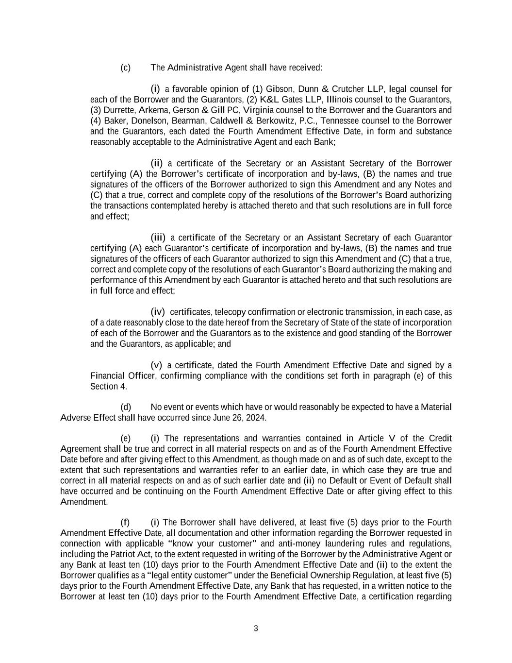 3 (c) The Administrative Agent shall have received: (i) a favorable opinion of (1) Gibson, Dunn & Crutcher LLP, legal counsel for each of the Borrower and the Guarantors, (2) K&L Gates LLP, Illinois counsel to the Guarantors, (3) Durrette, Arkema, Gerson & Gill PC, Virginia counsel to the Borrower and the Guarantors and (4) Baker, Donelson, Bearman, Caldwell & Berkowitz, P.C., Tennessee counsel to the Borrower and the Guarantors, each dated the Fourth Amendment Effective Date, in form and substance reasonably acceptable to the Administrative Agent and each Bank; (ii) a certificate of the Secretary or an Assistant Secretary of the Borrower certifying (A) the Borrower’s certificate of incorporation and by-laws, (B) the names and true signatures of the officers of the Borrower authorized to sign this Amendment and any Notes and (C) that a true, correct and complete copy of the resolutions of the Borrower’s Board authorizing the transactions contemplated hereby is attached thereto and that such resolutions are in full force and effect; (iii) a certificate of the Secretary or an Assistant Secretary of each Guarantor certifying (A) each Guarantor’s certificate of incorporation and by-laws, (B) the names and true signatures of the officers of each Guarantor authorized to sign this Amendment and (C) that a true, correct and complete copy of the resolutions of each Guarantor’s Board authorizing the making and performance of this Amendment by each Guarantor is attached hereto and that such resolutions are in full force and effect; (iv) certificates, telecopy confirmation or electronic transmission, in each case, as of a date reasonably close to the date hereof from the Secretary of State of the state of incorporation of each of the Borrower and the Guarantors as to the existence and good standing of the Borrower and the Guarantors, as applicable; and (v) a certificate, dated the Fourth Amendment Effective Date and signed by a Financial Officer, confirming compliance with the conditions set forth in paragraph (e) of this Section 4. (d) No event or events which have or would reasonably be expected to have a Material Adverse Effect shall have occurred since June 26, 2024. (e) (i) The representations and warranties contained in Article V of the Credit Agreement shall be true and correct in all material respects on and as of the Fourth Amendment Effective Date before and after giving effect to this Amendment, as though made on and as of such date, except to the extent that such representations and warranties refer to an earlier date, in which case they are true and correct in all material respects on and as of such earlier date and (ii) no Default or Event of Default shall have occurred and be continuing on the Fourth Amendment Effective Date or after giving effect to this Amendment. (f) (i) The Borrower shall have delivered, at least five (5) days prior to the Fourth Amendment Effective Date, all documentation and other information regarding the Borrower requested in connection with applicable “know your customer” and anti-money laundering rules and regulations, including the Patriot Act, to the extent requested in writing of the Borrower by the Administrative Agent or any Bank at least ten (10) days prior to the Fourth Amendment Effective Date and (ii) to the extent the Borrower qualifies as a “legal entity customer” under the Beneficial Ownership Regulation, at least five (5) days prior to the Fourth Amendment Effective Date, any Bank that has requested, in a written notice to the Borrower at least ten (10) days prior to the Fourth Amendment Effective Date, a certification regarding
