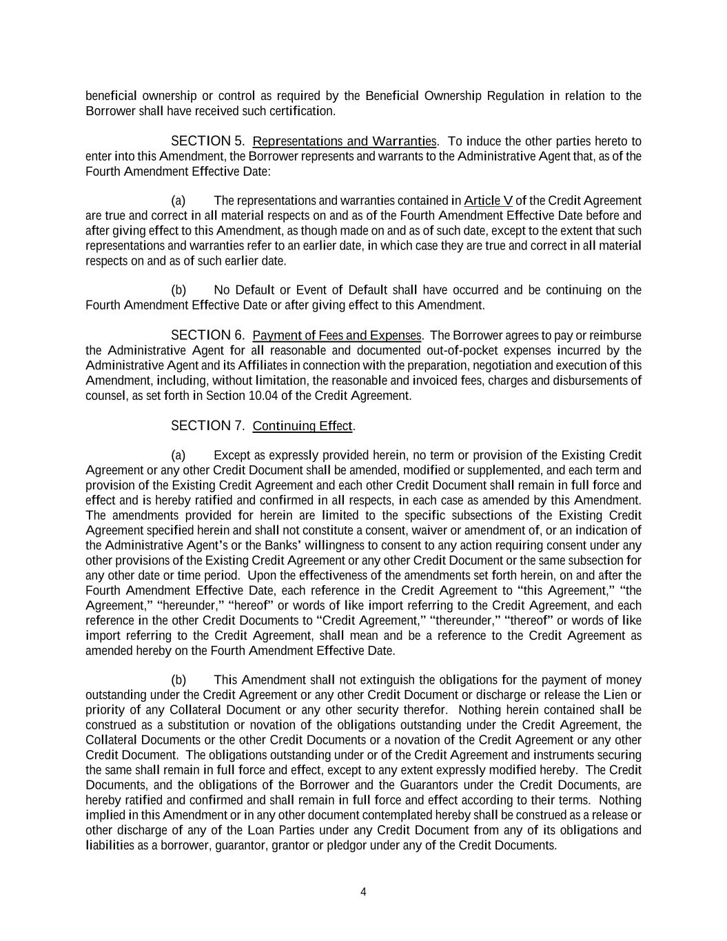 4 beneficial ownership or control as required by the Beneficial Ownership Regulation in relation to the Borrower shall have received such certification. SECTION 5. Representations and Warranties. To induce the other parties hereto to enter into this Amendment, the Borrower represents and warrants to the Administrative Agent that, as of the Fourth Amendment Effective Date: (a) The representations and warranties contained in Article V of the Credit Agreement are true and correct in all material respects on and as of the Fourth Amendment Effective Date before and after giving effect to this Amendment, as though made on and as of such date, except to the extent that such representations and warranties refer to an earlier date, in which case they are true and correct in all material respects on and as of such earlier date. (b) No Default or Event of Default shall have occurred and be continuing on the Fourth Amendment Effective Date or after giving effect to this Amendment. SECTION 6. Payment of Fees and Expenses. The Borrower agrees to pay or reimburse the Administrative Agent for all reasonable and documented out-of-pocket expenses incurred by the Administrative Agent and its Affiliates in connection with the preparation, negotiation and execution of this Amendment, including, without limitation, the reasonable and invoiced fees, charges and disbursements of counsel, as set forth in Section 10.04 of the Credit Agreement. SECTION 7. Continuing Effect. (a) Except as expressly provided herein, no term or provision of the Existing Credit Agreement or any other Credit Document shall be amended, modified or supplemented, and each term and provision of the Existing Credit Agreement and each other Credit Document shall remain in full force and effect and is hereby ratified and confirmed in all respects, in each case as amended by this Amendment. The amendments provided for herein are limited to the specific subsections of the Existing Credit Agreement specified herein and shall not constitute a consent, waiver or amendment of, or an indication of the Administrative Agent’s or the Banks’ willingness to consent to any action requiring consent under any other provisions of the Existing Credit Agreement or any other Credit Document or the same subsection for any other date or time period. Upon the effectiveness of the amendments set forth herein, on and after the Fourth Amendment Effective Date, each reference in the Credit Agreement to “this Agreement,” “the Agreement,” “hereunder,” “hereof” or words of like import referring to the Credit Agreement, and each reference in the other Credit Documents to “Credit Agreement,” “thereunder,” “thereof” or words of like import referring to the Credit Agreement, shall mean and be a reference to the Credit Agreement as amended hereby on the Fourth Amendment Effective Date. (b) This Amendment shall not extinguish the obligations for the payment of money outstanding under the Credit Agreement or any other Credit Document or discharge or release the Lien or priority of any Collateral Document or any other security therefor. Nothing herein contained shall be construed as a substitution or novation of the obligations outstanding under the Credit Agreement, the Collateral Documents or the other Credit Documents or a novation of the Credit Agreement or any other Credit Document. The obligations outstanding under or of the Credit Agreement and instruments securing the same shall remain in full force and effect, except to any extent expressly modified hereby. The Credit Documents, and the obligations of the Borrower and the Guarantors under the Credit Documents, are hereby ratified and confirmed and shall remain in full force and effect according to their terms. Nothing implied in this Amendment or in any other document contemplated hereby shall be construed as a release or other discharge of any of the Loan Parties under any Credit Document from any of its obligations and liabilities as a borrower, guarantor, grantor or pledgor under any of the Credit Documents.