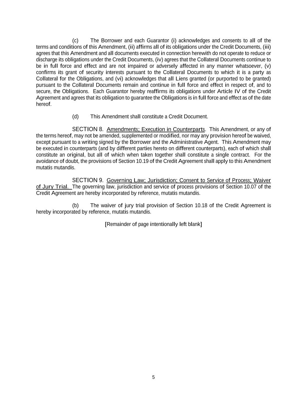 5 (c) The Borrower and each Guarantor (i) acknowledges and consents to all of the terms and conditions of this Amendment, (ii) affirms all of its obligations under the Credit Documents, (iii) agrees that this Amendment and all documents executed in connection herewith do not operate to reduce or discharge its obligations under the Credit Documents, (iv) agrees that the Collateral Documents continue to be in full force and effect and are not impaired or adversely affected in any manner whatsoever, (v) confirms its grant of security interests pursuant to the Collateral Documents to which it is a party as Collateral for the Obligations, and (vi) acknowledges that all Liens granted (or purported to be granted) pursuant to the Collateral Documents remain and continue in full force and effect in respect of, and to secure, the Obligations. Each Guarantor hereby reaffirms its obligations under Article IV of the Credit Agreement and agrees that its obligation to guarantee the Obligations is in full force and effect as of the date hereof. (d) This Amendment shall constitute a Credit Document. SECTION 8. Amendments; Execution in Counterparts. This Amendment, or any of the terms hereof, may not be amended, supplemented or modified, nor may any provision hereof be waived, except pursuant to a writing signed by the Borrower and the Administrative Agent. This Amendment may be executed in counterparts (and by different parties hereto on different counterparts), each of which shall constitute an original, but all of which when taken together shall constitute a single contract. For the avoidance of doubt, the provisions of Section 10.19 of the Credit Agreement shall apply to this Amendment mutatis mutandis. SECTION 9. Governing Law; Jurisdiction; Consent to Service of Process; Waiver of Jury Trial. The governing law, jurisdiction and service of process provisions of Section 10.07 of the Credit Agreement are hereby incorporated by reference, mutatis mutandis. (b) The waiver of jury trial provision of Section 10.18 of the Credit Agreement is hereby incorporated by reference, mutatis mutandis. [Remainder of page intentionally left blank]