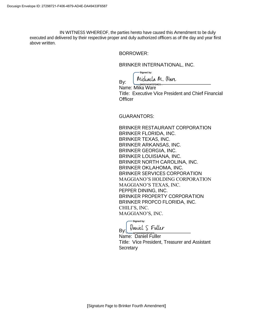 [Signature Page to Brinker Fourth Amendment] IN WITNESS WHEREOF, the parties hereto have caused this Amendment to be duly executed and delivered by their respective proper and duly authorized officers as of the day and year first above written. BORROWER: BRINKER INTERNATIONAL, INC. By: _______________________________ Name: Mika Ware Title: Executive Vice President and Chief Financial Officer GUARANTORS: BRINKER RESTAURANT CORPORATION BRINKER FLORIDA, INC. BRINKER TEXAS, INC. BRINKER ARKANSAS, INC. BRINKER GEORGIA, INC. BRINKER LOUISIANA, INC. BRINKER NORTH CAROLINA, INC. BRINKER OKLAHOMA, INC. BRINKER SERVICES CORPORATION MAGGIANO’S HOLDING CORPORATION MAGGIANO’S TEXAS, INC. PEPPER DINING, INC. BRINKER PROPERTY CORPORATION BRINKER PROPCO FLORIDA, INC. CHILI’S, INC. MAGGIANO’S, INC. By:__________________________ Name: Daniel Fuller Title: Vice President, Treasurer and Assistant Secretary Docusign Envelope ID: 27298721-F406-4879-AD4E-DA49433F6587