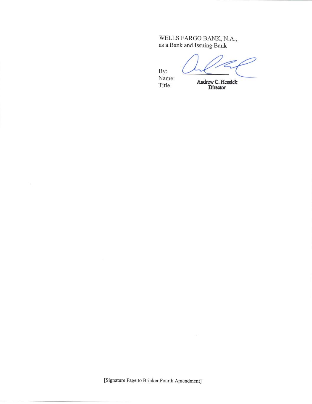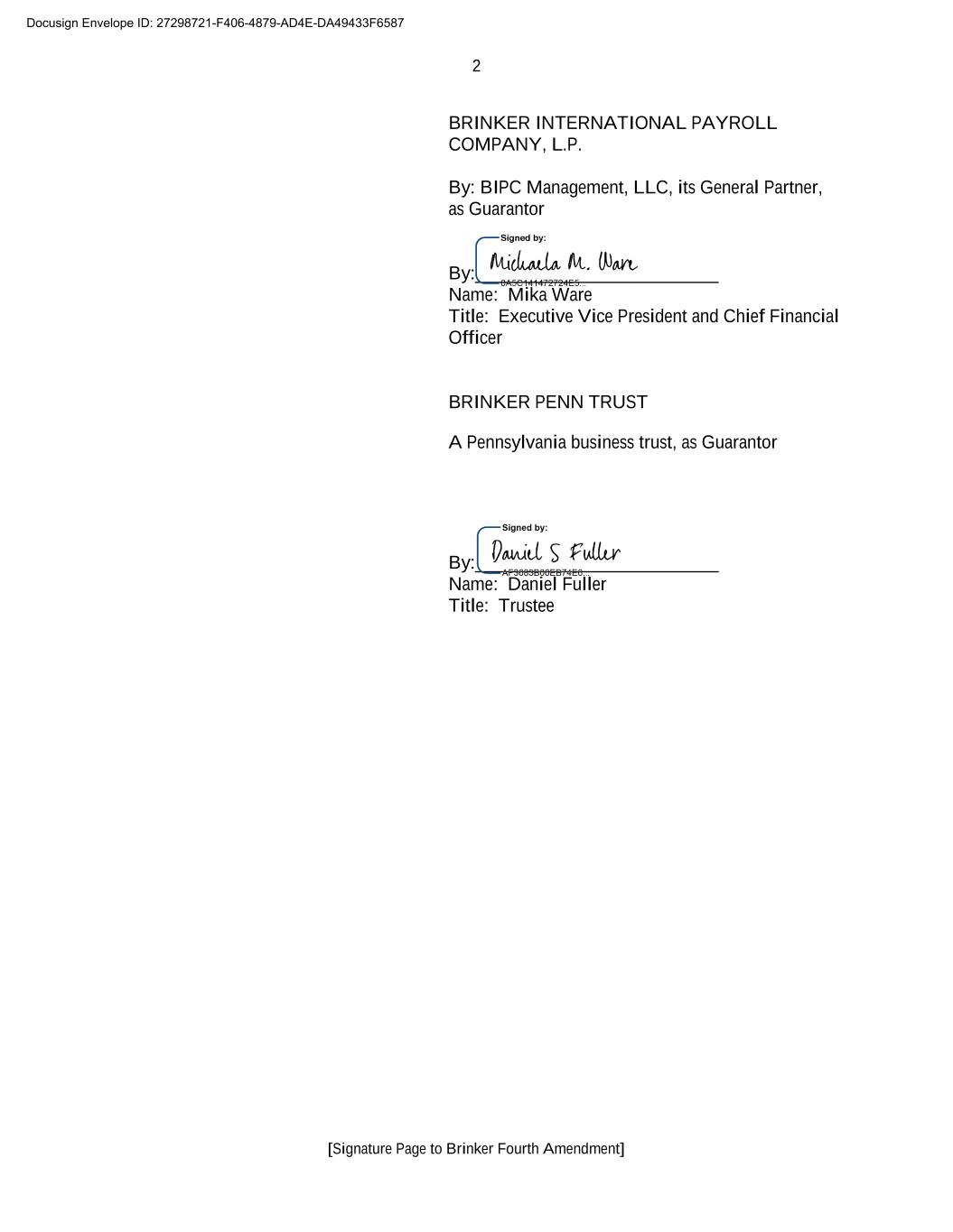 2 [Signature Page to Brinker Fourth Amendment] BRINKER INTERNATIONAL PAYROLL COMPANY, L.P. By: BIPC Management, LLC, its General Partner, as Guarantor By:__________________________ Name: Mika Ware Title: Executive Vice President and Chief Financial Officer BRINKER PENN TRUST A Pennsylvania business trust, as Guarantor By:__________________________ Name: Daniel Fuller Title: Trustee Docusign Envelope ID: 27298721-F406-4879-AD4E-DA49433F6587