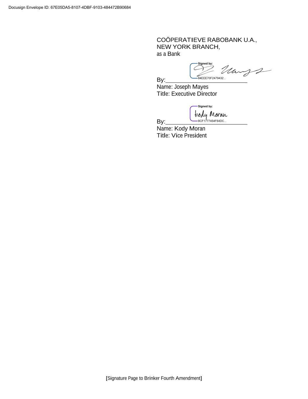 [Signature Page to Brinker Fourth Amendment] COÖPERATIEVE RABOBANK U.A., NEW YORK BRANCH, as a Bank By: Name: Joseph Mayes Title: Executive Director By: Name: Kody Moran Title: Vice President Docusign Envelope ID: 67E05DA5-8107-4DBF-9103-484472B90684