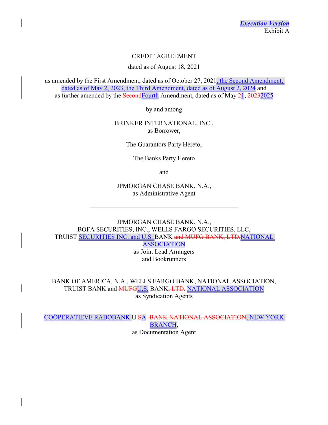 Execution Version Exhibit A CREDIT AGREEMENT dated as of August 18, 2021 as amended by the First Amendment, dated as of October 27, 2021, the Second Amendment, dated as of May 2, 2023, the Third Amendment, dated as of August 2, 2024 and as further amended by the SecondFourth Amendment, dated as of May 21, 20232025 by and among BRINKER INTERNATIONAL, INC., as Borrower, The Guarantors Party Hereto, The Banks Party Hereto and JPMORGAN CHASE BANK, N.A., as Administrative Agent ______________________________________________ JPMORGAN CHASE BANK, N.A., BOFA SECURITIES, INC., WELLS FARGO SECURITIES, LLC, TRUIST SECURITIES INC. and U.S. BANK and MUFG BANK, LTD.NATIONAL ASSOCIATION as Joint Lead Arrangers and Bookrunners BANK OF AMERICA, N.A., WELLS FARGO BANK, NATIONAL ASSOCIATION, TRUIST BANK and MUFGU.S. BANK, LTD. NATIONAL ASSOCIATION as Syndication Agents COÖPERATIEVE RABOBANK U.SA. BANK NATIONAL ASSOCIATION, NEW YORK BRANCH, as Documentation Agent