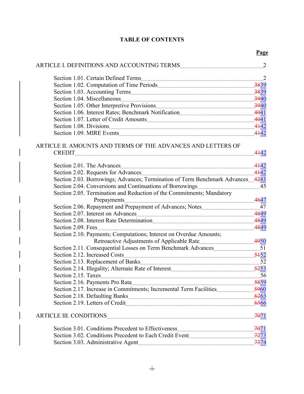 -i- TABLE OF CONTENTS Page ARTICLE I. DEFINITIONS AND ACCOUNTING TERMS 2 Section 1.01. Certain Defined Terms 2 Section 1.02. Computation of Time Periods 3839 Section 1.03. Accounting Terms 3839 Section 1.04. Miscellaneous 3940 Section 1.05. Other Interpretive Provisions 3940 Section 1.06. Interest Rates; Benchmark Notification 4041 Section 1.07. Letter of Credit Amounts 4041 Section 1.08. Divisions 4142 Section 1.09. MIRE Events 4142 ARTICLE II. AMOUNTS AND TERMS OF THE ADVANCES AND LETTERS OF CREDIT 4142 Section 2.01. The Advances 4142 Section 2.02. Requests for Advances 4142 Section 2.03. Borrowings; Advances; Termination of Term Benchmark Advances 4243 Section 2.04. Conversions and Continuations of Borrowings 45 Section 2.05. Termination and Reduction of the Commitments; Mandatory Prepayments 4647 Section 2.06. Repayment and Prepayment of Advances; Notes 47 Section 2.07. Interest on Advances 4849 Section 2.08. Interest Rate Determination 4849 Section 2.09. Fees 4849 Section 2.10. Payments; Computations; Interest on Overdue Amounts; Retroactive Adjustments of Applicable Rate 4950 Section 2.11. Consequential Losses on Term Benchmark Advances 51 Section 2.12. Increased Costs 5152 Section 2.13. Replacement of Banks 52 Section 2.14. Illegality; Alternate Rate of Interest 5253 Section 2.15. Taxes 56 Section 2.16. Payments Pro Rata 5859 Section 2.17. Increase in Commitments; Incremental Term Facilities 5960 Section 2.18. Defaulting Banks 6263 Section 2.19. Letters of Credit 6566 ARTICLE III. CONDITIONS 7071 Section 3.01. Conditions Precedent to Effectiveness 7071 Section 3.02. Conditions Precedent to Each Credit Event 7273 Section 3.03. Administrative Agent 7374