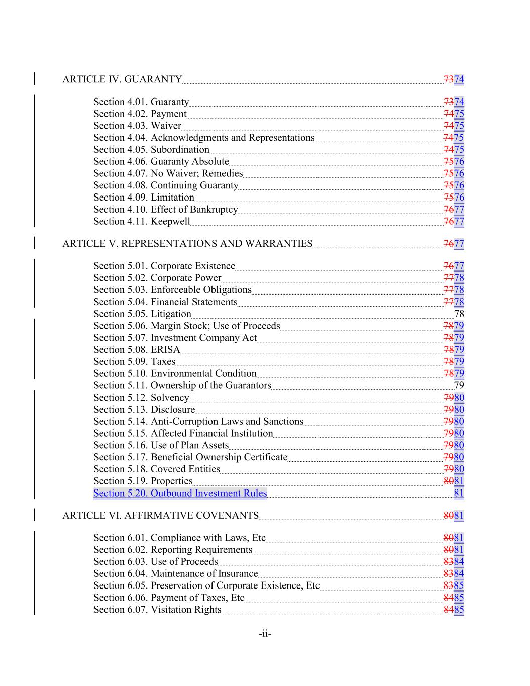 -ii- ARTICLE IV. GUARANTY 7374 Section 4.01. Guaranty 7374 Section 4.02. Payment 7475 Section 4.03. Waiver 7475 Section 4.04. Acknowledgments and Representations 7475 Section 4.05. Subordination 7475 Section 4.06. Guaranty Absolute 7576 Section 4.07. No Waiver; Remedies 7576 Section 4.08. Continuing Guaranty 7576 Section 4.09. Limitation 7576 Section 4.10. Effect of Bankruptcy 7677 Section 4.11. Keepwell 7677 ARTICLE V. REPRESENTATIONS AND WARRANTIES 7677 Section 5.01. Corporate Existence 7677 Section 5.02. Corporate Power 7778 Section 5.03. Enforceable Obligations 7778 Section 5.04. Financial Statements 7778 Section 5.05. Litigation 78 Section 5.06. Margin Stock; Use of Proceeds 7879 Section 5.07. Investment Company Act 7879 Section 5.08. ERISA 7879 Section 5.09. Taxes 7879 Section 5.10. Environmental Condition 7879 Section 5.11. Ownership of the Guarantors 79 Section 5.12. Solvency 7980 Section 5.13. Disclosure 7980 Section 5.14. Anti-Corruption Laws and Sanctions 7980 Section 5.15. Affected Financial Institution 7980 Section 5.16. Use of Plan Assets 7980 Section 5.17. Beneficial Ownership Certificate 7980 Section 5.18. Covered Entities 7980 Section 5.19. Properties 8081 Section 5.20. Outbound Investment Rules 81 ARTICLE VI. AFFIRMATIVE COVENANTS 8081 Section 6.01. Compliance with Laws, Etc 8081 Section 6.02. Reporting Requirements 8081 Section 6.03. Use of Proceeds 8384 Section 6.04. Maintenance of Insurance 8384 Section 6.05. Preservation of Corporate Existence, Etc 8385 Section 6.06. Payment of Taxes, Etc 8485 Section 6.07. Visitation Rights 8485
