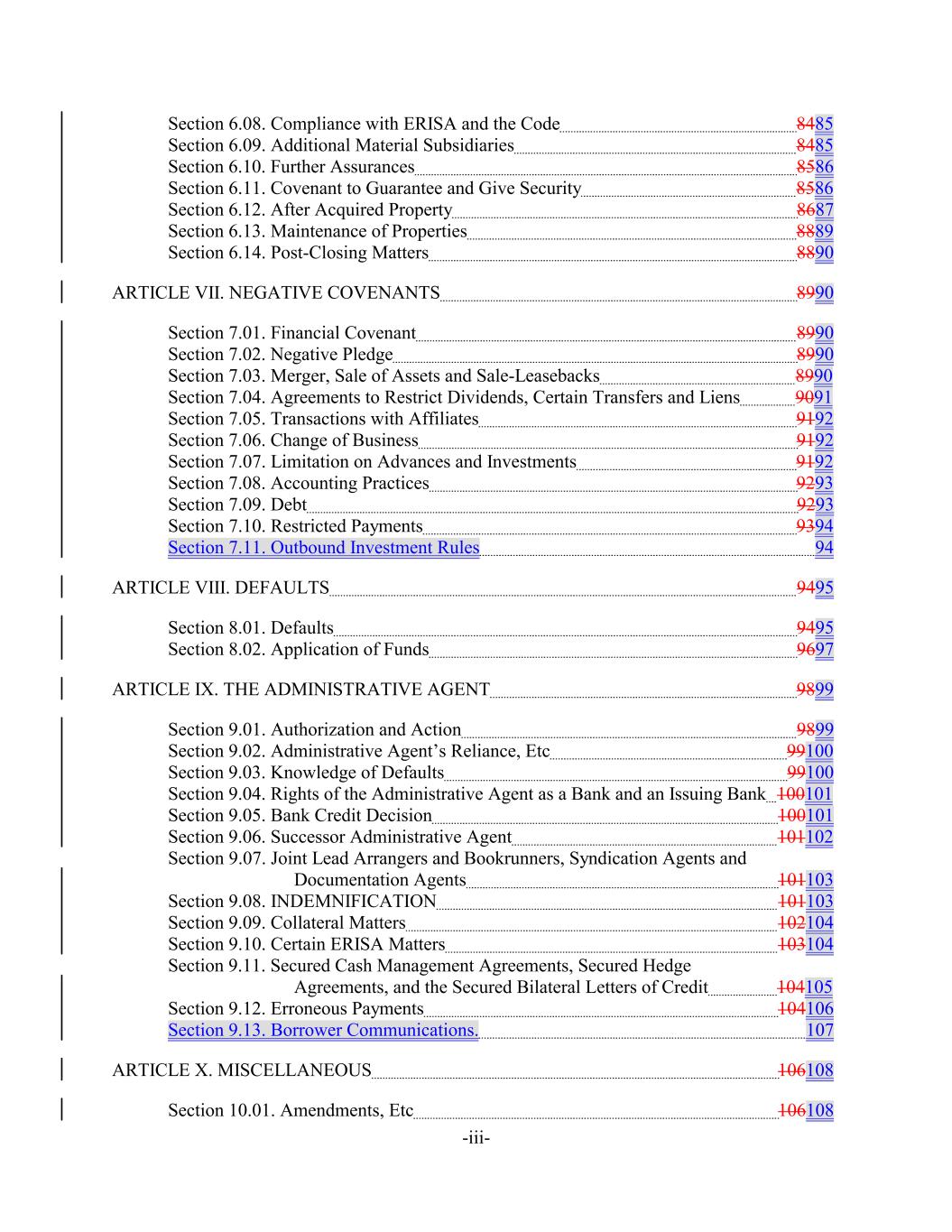 -iii- Section 6.08. Compliance with ERISA and the Code 8485 Section 6.09. Additional Material Subsidiaries 8485 Section 6.10. Further Assurances 8586 Section 6.11. Covenant to Guarantee and Give Security 8586 Section 6.12. After Acquired Property 8687 Section 6.13. Maintenance of Properties 8889 Section 6.14. Post-Closing Matters 8890 ARTICLE VII. NEGATIVE COVENANTS 8990 Section 7.01. Financial Covenant 8990 Section 7.02. Negative Pledge 8990 Section 7.03. Merger, Sale of Assets and Sale-Leasebacks 8990 Section 7.04. Agreements to Restrict Dividends, Certain Transfers and Liens 9091 Section 7.05. Transactions with Affiliates 9192 Section 7.06. Change of Business 9192 Section 7.07. Limitation on Advances and Investments 9192 Section 7.08. Accounting Practices 9293 Section 7.09. Debt 9293 Section 7.10. Restricted Payments 9394 Section 7.11. Outbound Investment Rules 94 ARTICLE VIII. DEFAULTS 9495 Section 8.01. Defaults 9495 Section 8.02. Application of Funds 9697 ARTICLE IX. THE ADMINISTRATIVE AGENT 9899 Section 9.01. Authorization and Action 9899 Section 9.02. Administrative Agent’s Reliance, Etc 99100 Section 9.03. Knowledge of Defaults 99100 Section 9.04. Rights of the Administrative Agent as a Bank and an Issuing Bank 100101 Section 9.05. Bank Credit Decision 100101 Section 9.06. Successor Administrative Agent 101102 Section 9.07. Joint Lead Arrangers and Bookrunners, Syndication Agents and Documentation Agents 101103 Section 9.08. INDEMNIFICATION 101103 Section 9.09. Collateral Matters 102104 Section 9.10. Certain ERISA Matters 103104 Section 9.11. Secured Cash Management Agreements, Secured Hedge Agreements, and the Secured Bilateral Letters of Credit 104105 Section 9.12. Erroneous Payments 104106 Section 9.13. Borrower Communications. 107 ARTICLE X. MISCELLANEOUS 106108 Section 10.01. Amendments, Etc 106108