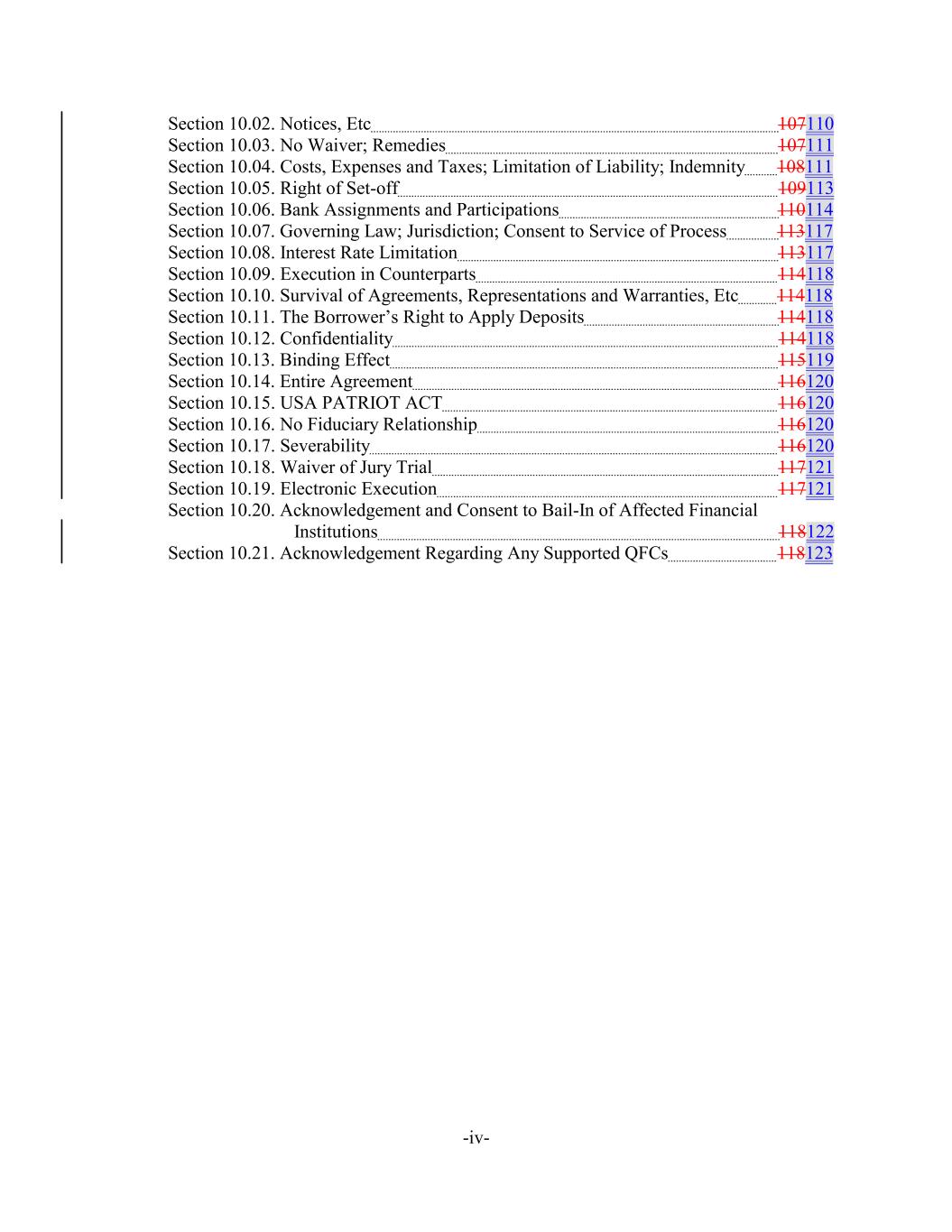 -iv- Section 10.02. Notices, Etc 107110 Section 10.03. No Waiver; Remedies 107111 Section 10.04. Costs, Expenses and Taxes; Limitation of Liability; Indemnity 108111 Section 10.05. Right of Set-off 109113 Section 10.06. Bank Assignments and Participations 110114 Section 10.07. Governing Law; Jurisdiction; Consent to Service of Process 113117 Section 10.08. Interest Rate Limitation 113117 Section 10.09. Execution in Counterparts 114118 Section 10.10. Survival of Agreements, Representations and Warranties, Etc 114118 Section 10.11. The Borrower’s Right to Apply Deposits 114118 Section 10.12. Confidentiality 114118 Section 10.13. Binding Effect 115119 Section 10.14. Entire Agreement 116120 Section 10.15. USA PATRIOT ACT 116120 Section 10.16. No Fiduciary Relationship 116120 Section 10.17. Severability 116120 Section 10.18. Waiver of Jury Trial 117121 Section 10.19. Electronic Execution 117121 Section 10.20. Acknowledgement and Consent to Bail-In of Affected Financial Institutions 118122 Section 10.21. Acknowledgement Regarding Any Supported QFCs 118123