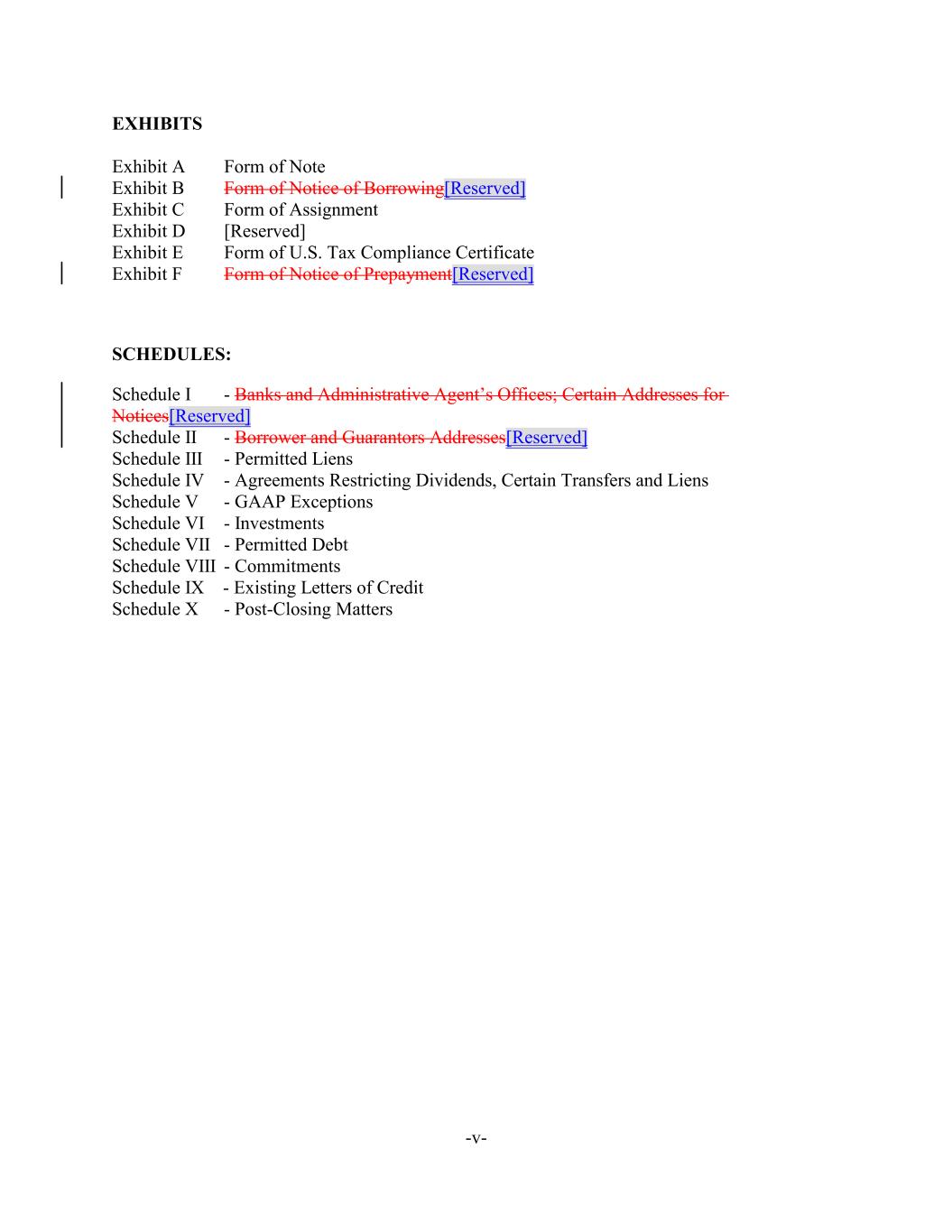 -v- EXHIBITS Exhibit A Form of Note Exhibit B Form of Notice of Borrowing[Reserved] Exhibit C Form of Assignment Exhibit D [Reserved] Exhibit E Form of U.S. Tax Compliance Certificate Exhibit F Form of Notice of Prepayment[Reserved] SCHEDULES: Schedule I - Banks and Administrative Agent’s Offices; Certain Addresses for Notices[Reserved] Schedule II - Borrower and Guarantors Addresses[Reserved] Schedule III - Permitted Liens Schedule IV - Agreements Restricting Dividends, Certain Transfers and Liens Schedule V - GAAP Exceptions Schedule VI - Investments Schedule VII - Permitted Debt Schedule VIII - Commitments Schedule IX - Existing Letters of Credit Schedule X - Post-Closing Matters