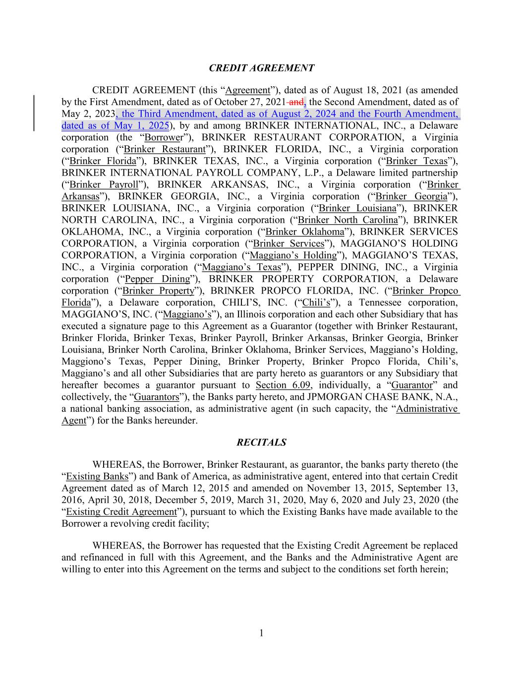 CREDIT AGREEMENT CREDIT AGREEMENT (this “Agreement”), dated as of August 18, 2021 (as amended by the First Amendment, dated as of October 27, 2021 and, the Second Amendment, dated as of May 2, 2023, the Third Amendment, dated as of August 2, 2024 and the Fourth Amendment, dated as of May 1, 2025), by and among BRINKER INTERNATIONAL, INC., a Delaware corporation (the “Borrower”), BRINKER RESTAURANT CORPORATION, a Virginia corporation (“Brinker Restaurant”), BRINKER FLORIDA, INC., a Virginia corporation (“Brinker Florida”), BRINKER TEXAS, INC., a Virginia corporation (“Brinker Texas”), BRINKER INTERNATIONAL PAYROLL COMPANY, L.P., a Delaware limited partnership (“Brinker Payroll”), BRINKER ARKANSAS, INC., a Virginia corporation (“Brinker Arkansas”), BRINKER GEORGIA, INC., a Virginia corporation (“Brinker Georgia”), BRINKER LOUISIANA, INC., a Virginia corporation (“Brinker Louisiana”), BRINKER NORTH CAROLINA, INC., a Virginia corporation (“Brinker North Carolina”), BRINKER OKLAHOMA, INC., a Virginia corporation (“Brinker Oklahoma”), BRINKER SERVICES CORPORATION, a Virginia corporation (“Brinker Services”), MAGGIANO’S HOLDING CORPORATION, a Virginia corporation (“Maggiano’s Holding”), MAGGIANO’S TEXAS, INC., a Virginia corporation (“Maggiano’s Texas”), PEPPER DINING, INC., a Virginia corporation (“Pepper Dining”), BRINKER PROPERTY CORPORATION, a Delaware corporation (“Brinker Property”), BRINKER PROPCO FLORIDA, INC. (“Brinker Propco Florida”), a Delaware corporation, CHILI’S, INC. (“Chili’s”), a Tennessee corporation, MAGGIANO’S, INC. (“Maggiano’s”), an Illinois corporation and each other Subsidiary that has executed a signature page to this Agreement as a Guarantor (together with Brinker Restaurant, Brinker Florida, Brinker Texas, Brinker Payroll, Brinker Arkansas, Brinker Georgia, Brinker Louisiana, Brinker North Carolina, Brinker Oklahoma, Brinker Services, Maggiano’s Holding, Maggiono’s Texas, Pepper Dining, Brinker Property, Brinker Propco Florida, Chili’s, Maggiano’s and all other Subsidiaries that are party hereto as guarantors or any Subsidiary that hereafter becomes a guarantor pursuant to Section 6.09, individually, a “Guarantor” and collectively, the “Guarantors”), the Banks party hereto, and JPMORGAN CHASE BANK, N.A., a national banking association, as administrative agent (in such capacity, the “Administrative Agent”) for the Banks hereunder. RECITALS WHEREAS, the Borrower, Brinker Restaurant, as guarantor, the banks party thereto (the “Existing Banks”) and Bank of America, as administrative agent, entered into that certain Credit Agreement dated as of March 12, 2015 and amended on November 13, 2015, September 13, 2016, April 30, 2018, December 5, 2019, March 31, 2020, May 6, 2020 and July 23, 2020 (the “Existing Credit Agreement”), pursuant to which the Existing Banks have made available to the Borrower a revolving credit facility; WHEREAS, the Borrower has requested that the Existing Credit Agreement be replaced and refinanced in full with this Agreement, and the Banks and the Administrative Agent are willing to enter into this Agreement on the terms and subject to the conditions set forth herein; 1
