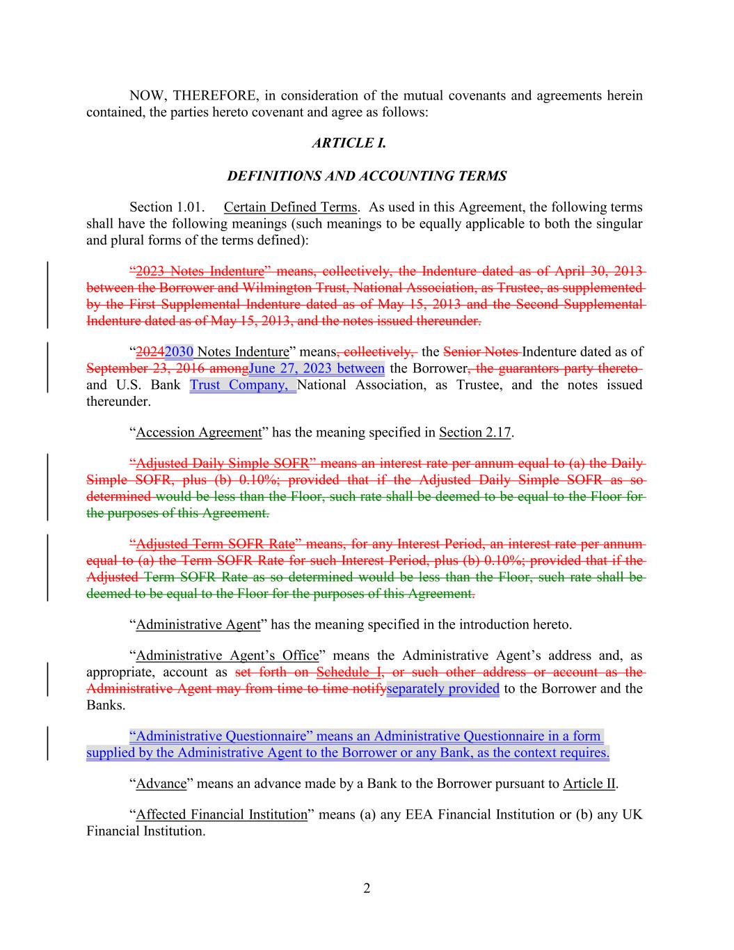 NOW, THEREFORE, in consideration of the mutual covenants and agreements herein contained, the parties hereto covenant and agree as follows: ARTICLE I. DEFINITIONS AND ACCOUNTING TERMS Section 1.01. Certain Defined Terms. As used in this Agreement, the following terms shall have the following meanings (such meanings to be equally applicable to both the singular and plural forms of the terms defined): “2023 Notes Indenture” means, collectively, the Indenture dated as of April 30, 2013 between the Borrower and Wilmington Trust, National Association, as Trustee, as supplemented by the First Supplemental Indenture dated as of May 15, 2013 and the Second Supplemental Indenture dated as of May 15, 2013, and the notes issued thereunder. “20242030 Notes Indenture” means, collectively, the Senior Notes Indenture dated as of September 23, 2016 amongJune 27, 2023 between the Borrower, the guarantors party thereto and U.S. Bank Trust Company, National Association, as Trustee, and the notes issued thereunder. “Accession Agreement” has the meaning specified in Section 2.17. “Adjusted Daily Simple SOFR” means an interest rate per annum equal to (a) the Daily Simple SOFR, plus (b) 0.10%; provided that if the Adjusted Daily Simple SOFR as so determined would be less than the Floor, such rate shall be deemed to be equal to the Floor for the purposes of this Agreement. “Adjusted Term SOFR Rate” means, for any Interest Period, an interest rate per annum equal to (a) the Term SOFR Rate for such Interest Period, plus (b) 0.10%; provided that if the Adjusted Term SOFR Rate as so determined would be less than the Floor, such rate shall be deemed to be equal to the Floor for the purposes of this Agreement. “Administrative Agent” has the meaning specified in the introduction hereto. “Administrative Agent’s Office” means the Administrative Agent’s address and, as appropriate, account as set forth on Schedule I, or such other address or account as the Administrative Agent may from time to time notifyseparately provided to the Borrower and the Banks. “Administrative Questionnaire” means an Administrative Questionnaire in a form supplied by the Administrative Agent to the Borrower or any Bank, as the context requires. “Advance” means an advance made by a Bank to the Borrower pursuant to Article II. “Affected Financial Institution” means (a) any EEA Financial Institution or (b) any UK Financial Institution. 2