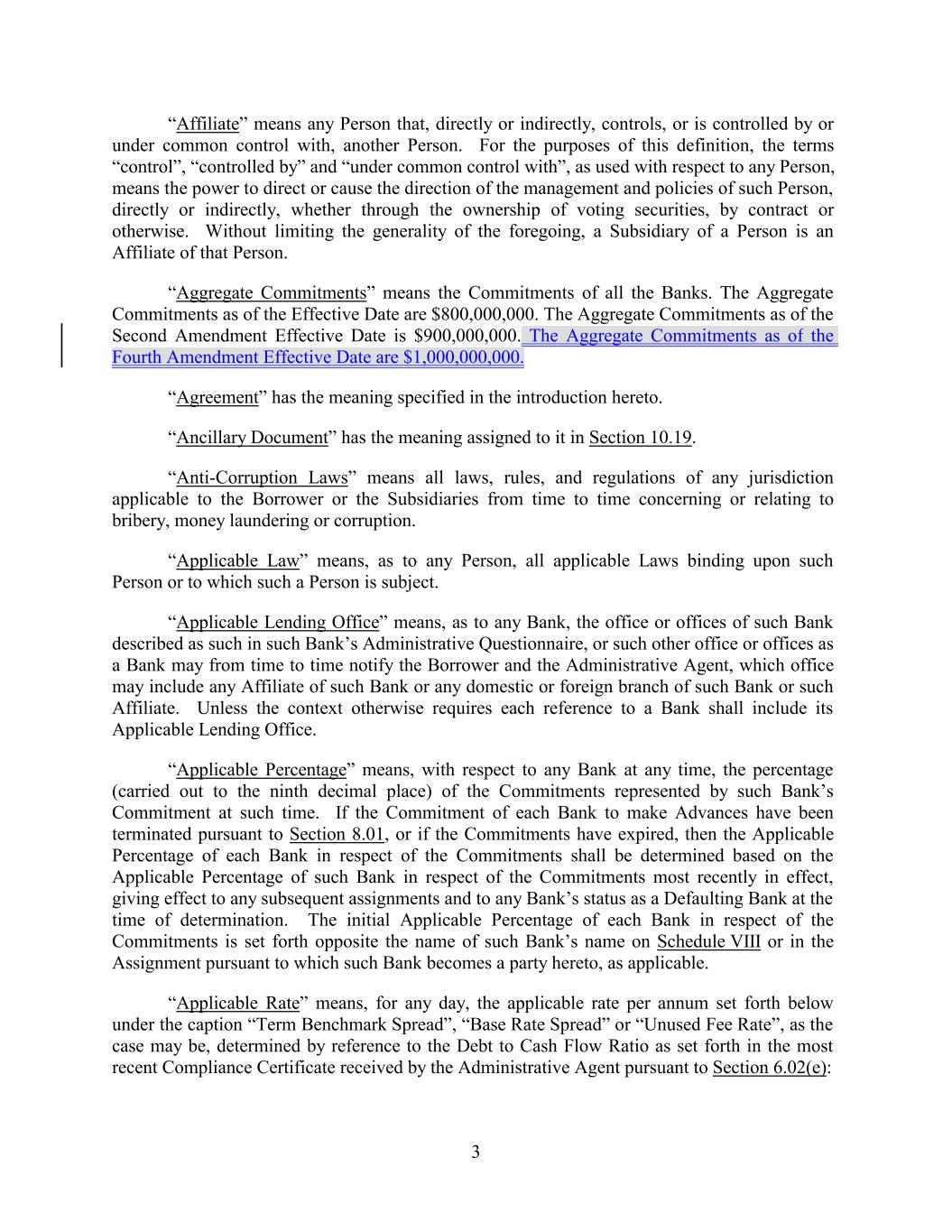 “Affiliate” means any Person that, directly or indirectly, controls, or is controlled by or under common control with, another Person. For the purposes of this definition, the terms “control”, “controlled by” and “under common control with”, as used with respect to any Person, means the power to direct or cause the direction of the management and policies of such Person, directly or indirectly, whether through the ownership of voting securities, by contract or otherwise. Without limiting the generality of the foregoing, a Subsidiary of a Person is an Affiliate of that Person. “Aggregate Commitments” means the Commitments of all the Banks. The Aggregate Commitments as of the Effective Date are $800,000,000. The Aggregate Commitments as of the Second Amendment Effective Date is $900,000,000. The Aggregate Commitments as of the Fourth Amendment Effective Date are $1,000,000,000. “Agreement” has the meaning specified in the introduction hereto. “Ancillary Document” has the meaning assigned to it in Section 10.19. “Anti-Corruption Laws” means all laws, rules, and regulations of any jurisdiction applicable to the Borrower or the Subsidiaries from time to time concerning or relating to bribery, money laundering or corruption. “Applicable Law” means, as to any Person, all applicable Laws binding upon such Person or to which such a Person is subject. “Applicable Lending Office” means, as to any Bank, the office or offices of such Bank described as such in such Bank’s Administrative Questionnaire, or such other office or offices as a Bank may from time to time notify the Borrower and the Administrative Agent, which office may include any Affiliate of such Bank or any domestic or foreign branch of such Bank or such Affiliate. Unless the context otherwise requires each reference to a Bank shall include its Applicable Lending Office. “Applicable Percentage” means, with respect to any Bank at any time, the percentage (carried out to the ninth decimal place) of the Commitments represented by such Bank’s Commitment at such time. If the Commitment of each Bank to make Advances have been terminated pursuant to Section 8.01, or if the Commitments have expired, then the Applicable Percentage of each Bank in respect of the Commitments shall be determined based on the Applicable Percentage of such Bank in respect of the Commitments most recently in effect, giving effect to any subsequent assignments and to any Bank’s status as a Defaulting Bank at the time of determination. The initial Applicable Percentage of each Bank in respect of the Commitments is set forth opposite the name of such Bank’s name on Schedule VIII or in the Assignment pursuant to which such Bank becomes a party hereto, as applicable. “Applicable Rate” means, for any day, the applicable rate per annum set forth below under the caption “Term Benchmark Spread”, “Base Rate Spread” or “Unused Fee Rate”, as the case may be, determined by reference to the Debt to Cash Flow Ratio as set forth in the most recent Compliance Certificate received by the Administrative Agent pursuant to Section 6.02(e): 3