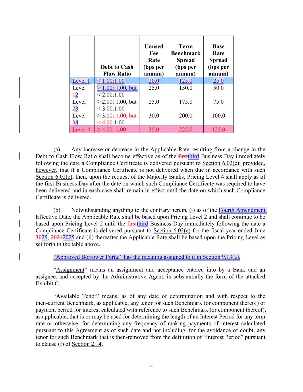 4 < 1.00:1.00 Level 23 Unused Fee Rate (bps per annum) ≥ 2.00: 1.00, but < 3.00:1.00 20.0 25.0 175.0 125.0 75.0 Term Benchmark Spread (bps per annum) 25.0 Level 34 ≥ 3.00: 1.00, but < 4.00:1.00 30.0 Base Rate Spread (bps per annum) 200.0 Level 12 100.0 ≥ 1.00: 1.00, but < 2.00:1.00 Level 4 ≥ 4.00: 1.00 25.0 35.0 Debt to Cash Flow Ratio 225.0 150.0 125.0 Level 1 (a) Any increase or decrease in the Applicable Rate resulting from a change in the Debt to Cash Flow Ratio shall become effective as of the firstthird Business Day immediately following the date a Compliance Certificate is delivered pursuant to Section 6.02(e); provided, however, that if a Compliance Certificate is not delivered when due in accordance with such Section 6.02(e), then, upon the request of the Majority Banks, Pricing Level 4 shall apply as of the first Business Day after the date on which such Compliance Certificate was required to have been delivered and in each case shall remain in effect until the date on which such Compliance Certificate is delivered. (b) Notwithstanding anything to the contrary herein, (i) as of the Fourth Amendment Effective Date, the Applicable Rate shall be based upon Pricing Level 2 and shall continue to be based upon Pricing Level 2 until the firstthird Business Day immediately following the date a Compliance Certificate is delivered pursuant to Section 6.02(e) for the fiscal year ended June 3025, 20212025 and (ii) thereafter the Applicable Rate shall be based upon the Pricing Level as set forth in the table above. “Approved Borrower Portal” has the meaning assigned to it in Section 9.13(a). “Assignment” means an assignment and acceptance entered into by a Bank and an assignee, and accepted by the Administrative Agent, in substantially the form of the attached Exhibit C. “Available Tenor” means, as of any date of determination and with respect to the then-current Benchmark, as applicable, any tenor for such Benchmark (or component thereof) or payment period for interest calculated with reference to such Benchmark (or component thereof), as applicable, that is or may be used for determining the length of an Interest Period for any term rate or otherwise, for determining any frequency of making payments of interest calculated pursuant to this Agreement as of such date and not including, for the avoidance of doubt, any tenor for such Benchmark that is then-removed from the definition of “Interest Period” pursuant to clause (f) of Section 2.14. 50.0