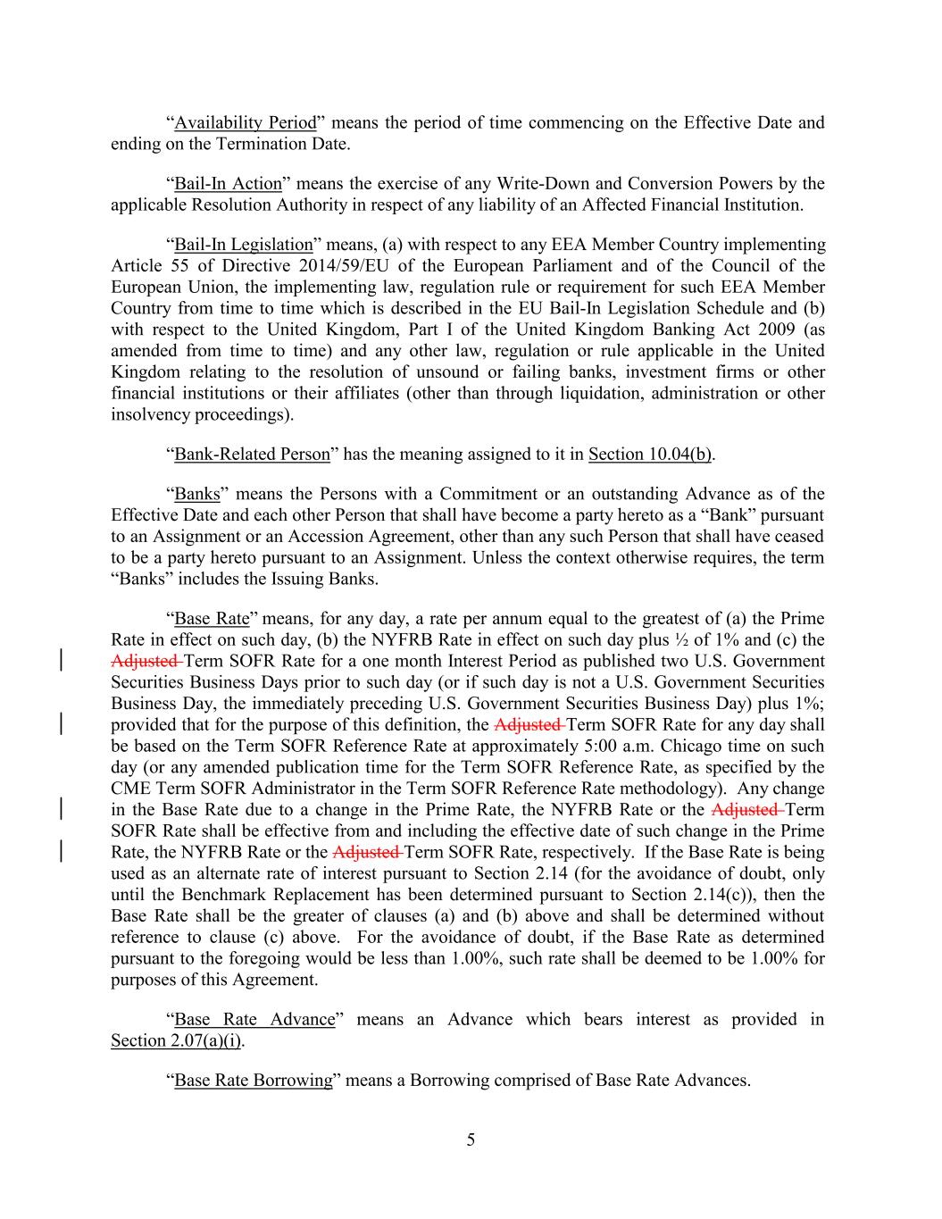 “Availability Period” means the period of time commencing on the Effective Date and ending on the Termination Date. “Bail-In Action” means the exercise of any Write-Down and Conversion Powers by the applicable Resolution Authority in respect of any liability of an Affected Financial Institution. “Bail-In Legislation” means, (a) with respect to any EEA Member Country implementing Article 55 of Directive 2014/59/EU of the European Parliament and of the Council of the European Union, the implementing law, regulation rule or requirement for such EEA Member Country from time to time which is described in the EU Bail-In Legislation Schedule and (b) with respect to the United Kingdom, Part I of the United Kingdom Banking Act 2009 (as amended from time to time) and any other law, regulation or rule applicable in the United Kingdom relating to the resolution of unsound or failing banks, investment firms or other financial institutions or their affiliates (other than through liquidation, administration or other insolvency proceedings). “Bank-Related Person” has the meaning assigned to it in Section 10.04(b). “Banks” means the Persons with a Commitment or an outstanding Advance as of the Effective Date and each other Person that shall have become a party hereto as a “Bank” pursuant to an Assignment or an Accession Agreement, other than any such Person that shall have ceased to be a party hereto pursuant to an Assignment. Unless the context otherwise requires, the term “Banks” includes the Issuing Banks. “Base Rate” means, for any day, a rate per annum equal to the greatest of (a) the Prime Rate in effect on such day, (b) the NYFRB Rate in effect on such day plus ½ of 1% and (c) the Adjusted Term SOFR Rate for a one month Interest Period as published two U.S. Government Securities Business Days prior to such day (or if such day is not a U.S. Government Securities Business Day, the immediately preceding U.S. Government Securities Business Day) plus 1%; provided that for the purpose of this definition, the Adjusted Term SOFR Rate for any day shall be based on the Term SOFR Reference Rate at approximately 5:00 a.m. Chicago time on such day (or any amended publication time for the Term SOFR Reference Rate, as specified by the CME Term SOFR Administrator in the Term SOFR Reference Rate methodology). Any change in the Base Rate due to a change in the Prime Rate, the NYFRB Rate or the Adjusted Term SOFR Rate shall be effective from and including the effective date of such change in the Prime Rate, the NYFRB Rate or the Adjusted Term SOFR Rate, respectively. If the Base Rate is being used as an alternate rate of interest pursuant to Section 2.14 (for the avoidance of doubt, only until the Benchmark Replacement has been determined pursuant to Section 2.14(c)), then the Base Rate shall be the greater of clauses (a) and (b) above and shall be determined without reference to clause (c) above. For the avoidance of doubt, if the Base Rate as determined pursuant to the foregoing would be less than 1.00%, such rate shall be deemed to be 1.00% for purposes of this Agreement. “Base Rate Advance” means an Advance which bears interest as provided in Section 2.07(a)(i). “Base Rate Borrowing” means a Borrowing comprised of Base Rate Advances. 5