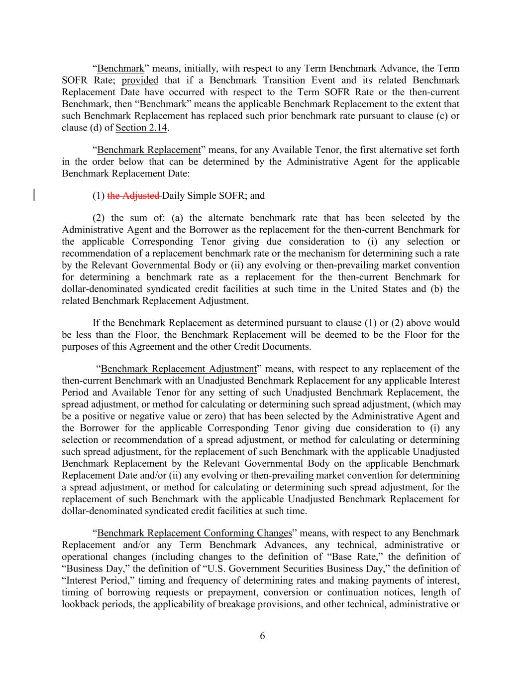 “Benchmark” means, initially, with respect to any Term Benchmark Advance, the Term SOFR Rate; provided that if a Benchmark Transition Event and its related Benchmark Replacement Date have occurred with respect to the Term SOFR Rate or the then-current Benchmark, then “Benchmark” means the applicable Benchmark Replacement to the extent that such Benchmark Replacement has replaced such prior benchmark rate pursuant to clause (c) or clause (d) of Section 2.14. “Benchmark Replacement” means, for any Available Tenor, the first alternative set forth in the order below that can be determined by the Administrative Agent for the applicable Benchmark Replacement Date: (1) the Adjusted Daily Simple SOFR; and (2) the sum of: (a) the alternate benchmark rate that has been selected by the Administrative Agent and the Borrower as the replacement for the then-current Benchmark for the applicable Corresponding Tenor giving due consideration to (i) any selection or recommendation of a replacement benchmark rate or the mechanism for determining such a rate by the Relevant Governmental Body or (ii) any evolving or then-prevailing market convention for determining a benchmark rate as a replacement for the then-current Benchmark for dollar-denominated syndicated credit facilities at such time in the United States and (b) the related Benchmark Replacement Adjustment. If the Benchmark Replacement as determined pursuant to clause (1) or (2) above would be less than the Floor, the Benchmark Replacement will be deemed to be the Floor for the purposes of this Agreement and the other Credit Documents. “Benchmark Replacement Adjustment” means, with respect to any replacement of the then-current Benchmark with an Unadjusted Benchmark Replacement for any applicable Interest Period and Available Tenor for any setting of such Unadjusted Benchmark Replacement, the spread adjustment, or method for calculating or determining such spread adjustment, (which may be a positive or negative value or zero) that has been selected by the Administrative Agent and the Borrower for the applicable Corresponding Tenor giving due consideration to (i) any selection or recommendation of a spread adjustment, or method for calculating or determining such spread adjustment, for the replacement of such Benchmark with the applicable Unadjusted Benchmark Replacement by the Relevant Governmental Body on the applicable Benchmark Replacement Date and/or (ii) any evolving or then-prevailing market convention for determining a spread adjustment, or method for calculating or determining such spread adjustment, for the replacement of such Benchmark with the applicable Unadjusted Benchmark Replacement for dollar-denominated syndicated credit facilities at such time. “Benchmark Replacement Conforming Changes” means, with respect to any Benchmark Replacement and/or any Term Benchmark Advances, any technical, administrative or operational changes (including changes to the definition of “Base Rate,” the definition of “Business Day,” the definition of “U.S. Government Securities Business Day,” the definition of “Interest Period,” timing and frequency of determining rates and making payments of interest, timing of borrowing requests or prepayment, conversion or continuation notices, length of lookback periods, the applicability of breakage provisions, and other technical, administrative or 6