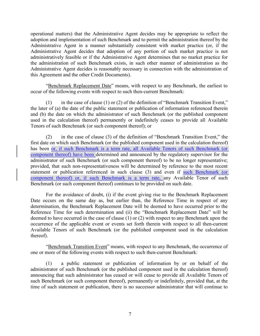 operational matters) that the Administrative Agent decides may be appropriate to reflect the adoption and implementation of such Benchmark and to permit the administration thereof by the Administrative Agent in a manner substantially consistent with market practice (or, if the Administrative Agent decides that adoption of any portion of such market practice is not administratively feasible or if the Administrative Agent determines that no market practice for the administration of such Benchmark exists, in such other manner of administration as the Administrative Agent decides is reasonably necessary in connection with the administration of this Agreement and the other Credit Documents). “Benchmark Replacement Date” means, with respect to any Benchmark, the earliest to occur of the following events with respect to such then-current Benchmark: (1) in the case of clause (1) or (2) of the definition of “Benchmark Transition Event,” the later of (a) the date of the public statement or publication of information referenced therein and (b) the date on which the administrator of such Benchmark (or the published component used in the calculation thereof) permanently or indefinitely ceases to provide all Available Tenors of such Benchmark (or such component thereof); or (2) in the case of clause (3) of the definition of “Benchmark Transition Event,” the first date on which such Benchmark (or the published component used in the calculation thereof) has been or, if such Benchmark is a term rate, all Available Tenors of such Benchmark (or component thereof) have been determined and announced by the regulatory supervisor for the administrator of such Benchmark (or such component thereof) to be no longer representative; provided, that such non-representativeness will be determined by reference to the most recent statement or publication referenced in such clause (3) and even if such Benchmark (or component thereof) or, if such Benchmark is a term rate, any Available Tenor of such Benchmark (or such component thereof) continues to be provided on such date. For the avoidance of doubt, (i) if the event giving rise to the Benchmark Replacement Date occurs on the same day as, but earlier than, the Reference Time in respect of any determination, the Benchmark Replacement Date will be deemed to have occurred prior to the Reference Time for such determination and (ii) the “Benchmark Replacement Date” will be deemed to have occurred in the case of clause (1) or (2) with respect to any Benchmark upon the occurrence of the applicable event or events set forth therein with respect to all then-current Available Tenors of such Benchmark (or the published component used in the calculation thereof). “Benchmark Transition Event” means, with respect to any Benchmark, the occurrence of one or more of the following events with respect to such then-current Benchmark: (1) a public statement or publication of information by or on behalf of the administrator of such Benchmark (or the published component used in the calculation thereof) announcing that such administrator has ceased or will cease to provide all Available Tenors of such Benchmark (or such component thereof), permanently or indefinitely, provided that, at the time of such statement or publication, there is no successor administrator that will continue to 7