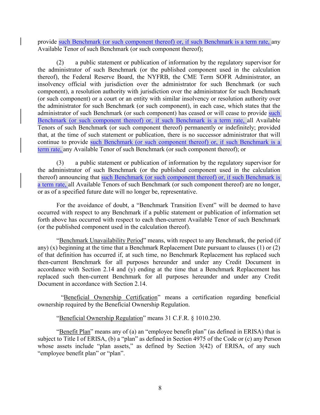 provide such Benchmark (or such component thereof) or, if such Benchmark is a term rate, any Available Tenor of such Benchmark (or such component thereof); (2) a public statement or publication of information by the regulatory supervisor for the administrator of such Benchmark (or the published component used in the calculation thereof), the Federal Reserve Board, the NYFRB, the CME Term SOFR Administrator, an insolvency official with jurisdiction over the administrator for such Benchmark (or such component), a resolution authority with jurisdiction over the administrator for such Benchmark (or such component) or a court or an entity with similar insolvency or resolution authority over the administrator for such Benchmark (or such component), in each case, which states that the administrator of such Benchmark (or such component) has ceased or will cease to provide such Benchmark (or such component thereof) or, if such Benchmark is a term rate, all Available Tenors of such Benchmark (or such component thereof) permanently or indefinitely; provided that, at the time of such statement or publication, there is no successor administrator that will continue to provide such Benchmark (or such component thereof) or, if such Benchmark is a term rate, any Available Tenor of such Benchmark (or such component thereof); or (3) a public statement or publication of information by the regulatory supervisor for the administrator of such Benchmark (or the published component used in the calculation thereof) announcing that such Benchmark (or such component thereof) or, if such Benchmark is a term rate, all Available Tenors of such Benchmark (or such component thereof) are no longer, or as of a specified future date will no longer be, representative. For the avoidance of doubt, a “Benchmark Transition Event” will be deemed to have occurred with respect to any Benchmark if a public statement or publication of information set forth above has occurred with respect to each then-current Available Tenor of such Benchmark (or the published component used in the calculation thereof). “Benchmark Unavailability Period” means, with respect to any Benchmark, the period (if any) (x) beginning at the time that a Benchmark Replacement Date pursuant to clauses (1) or (2) of that definition has occurred if, at such time, no Benchmark Replacement has replaced such then-current Benchmark for all purposes hereunder and under any Credit Document in accordance with Section 2.14 and (y) ending at the time that a Benchmark Replacement has replaced such then-current Benchmark for all purposes hereunder and under any Credit Document in accordance with Section 2.14. “Beneficial Ownership Certification” means a certification regarding beneficial ownership required by the Beneficial Ownership Regulation. “Beneficial Ownership Regulation” means 31 C.F.R. § 1010.230. “Benefit Plan” means any of (a) an “employee benefit plan” (as defined in ERISA) that is subject to Title I of ERISA, (b) a “plan” as defined in Section 4975 of the Code or (c) any Person whose assets include “plan assets,” as defined by Section 3(42) of ERISA, of any such “employee benefit plan” or “plan”. 8