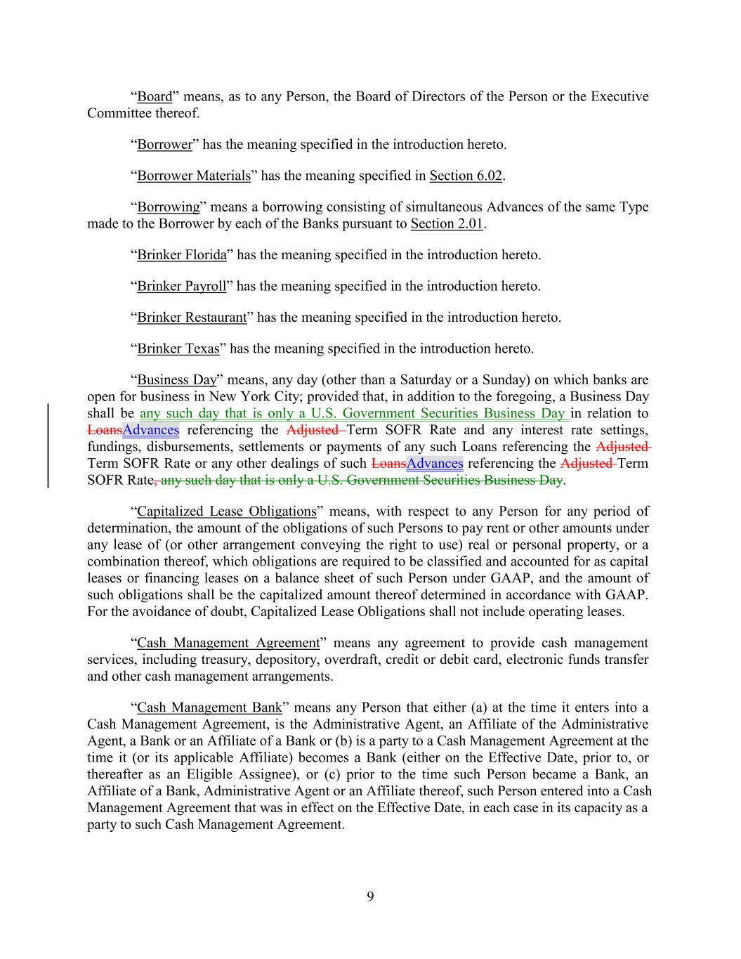 “Board” means, as to any Person, the Board of Directors of the Person or the Executive Committee thereof. “Borrower” has the meaning specified in the introduction hereto. “Borrower Materials” has the meaning specified in Section 6.02. “Borrowing” means a borrowing consisting of simultaneous Advances of the same Type made to the Borrower by each of the Banks pursuant to Section 2.01. “Brinker Florida” has the meaning specified in the introduction hereto. “Brinker Payroll” has the meaning specified in the introduction hereto. “Brinker Restaurant” has the meaning specified in the introduction hereto. “Brinker Texas” has the meaning specified in the introduction hereto. “Business Day” means, any day (other than a Saturday or a Sunday) on which banks are open for business in New York City; provided that, in addition to the foregoing, a Business Day shall be any such day that is only a U.S. Government Securities Business Day in relation to LoansAdvances referencing the Adjusted Term SOFR Rate and any interest rate settings, fundings, disbursements, settlements or payments of any such Loans referencing the Adjusted Term SOFR Rate or any other dealings of such LoansAdvances referencing the Adjusted Term SOFR Rate, any such day that is only a U.S. Government Securities Business Day. “Capitalized Lease Obligations” means, with respect to any Person for any period of determination, the amount of the obligations of such Persons to pay rent or other amounts under any lease of (or other arrangement conveying the right to use) real or personal property, or a combination thereof, which obligations are required to be classified and accounted for as capital leases or financing leases on a balance sheet of such Person under GAAP, and the amount of such obligations shall be the capitalized amount thereof determined in accordance with GAAP. For the avoidance of doubt, Capitalized Lease Obligations shall not include operating leases. “Cash Management Agreement” means any agreement to provide cash management services, including treasury, depository, overdraft, credit or debit card, electronic funds transfer and other cash management arrangements. “Cash Management Bank” means any Person that either (a) at the time it enters into a Cash Management Agreement, is the Administrative Agent, an Affiliate of the Administrative Agent, a Bank or an Affiliate of a Bank or (b) is a party to a Cash Management Agreement at the time it (or its applicable Affiliate) becomes a Bank (either on the Effective Date, prior to, or thereafter as an Eligible Assignee), or (c) prior to the time such Person became a Bank, an Affiliate of a Bank, Administrative Agent or an Affiliate thereof, such Person entered into a Cash Management Agreement that was in effect on the Effective Date, in each case in its capacity as a party to such Cash Management Agreement. 9
