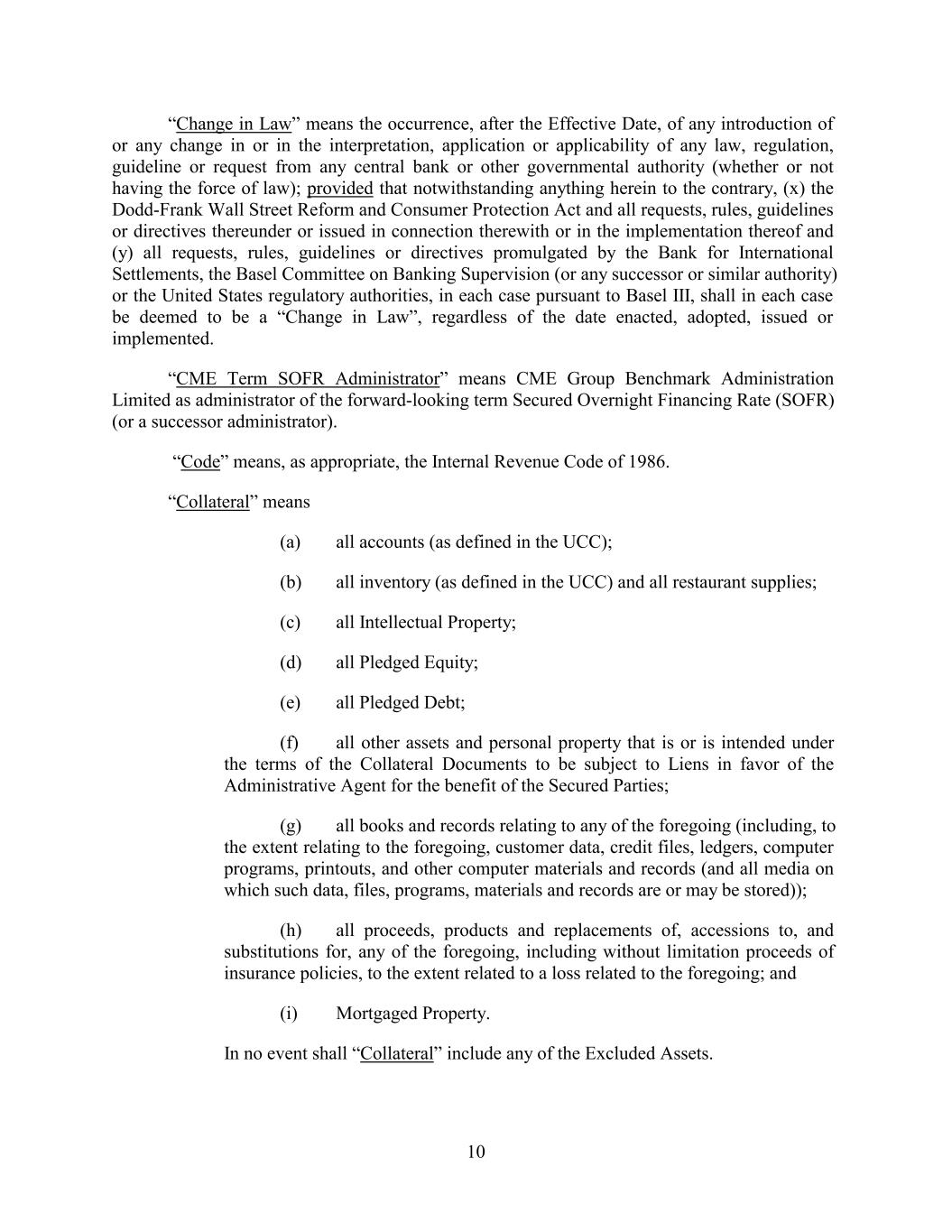 “Change in Law” means the occurrence, after the Effective Date, of any introduction of or any change in or in the interpretation, application or applicability of any law, regulation, guideline or request from any central bank or other governmental authority (whether or not having the force of law); provided that notwithstanding anything herein to the contrary, (x) the Dodd-Frank Wall Street Reform and Consumer Protection Act and all requests, rules, guidelines or directives thereunder or issued in connection therewith or in the implementation thereof and (y) all requests, rules, guidelines or directives promulgated by the Bank for International Settlements, the Basel Committee on Banking Supervision (or any successor or similar authority) or the United States regulatory authorities, in each case pursuant to Basel III, shall in each case be deemed to be a “Change in Law”, regardless of the date enacted, adopted, issued or implemented. “CME Term SOFR Administrator” means CME Group Benchmark Administration Limited as administrator of the forward-looking term Secured Overnight Financing Rate (SOFR) (or a successor administrator). “Code” means, as appropriate, the Internal Revenue Code of 1986. “Collateral” means (a) all accounts (as defined in the UCC); (b) all inventory (as defined in the UCC) and all restaurant supplies; (c) all Intellectual Property; (d) all Pledged Equity; (e) all Pledged Debt; (f) all other assets and personal property that is or is intended under the terms of the Collateral Documents to be subject to Liens in favor of the Administrative Agent for the benefit of the Secured Parties; (g) all books and records relating to any of the foregoing (including, to the extent relating to the foregoing, customer data, credit files, ledgers, computer programs, printouts, and other computer materials and records (and all media on which such data, files, programs, materials and records are or may be stored)); (h) all proceeds, products and replacements of, accessions to, and substitutions for, any of the foregoing, including without limitation proceeds of insurance policies, to the extent related to a loss related to the foregoing; and (i) Mortgaged Property. In no event shall “Collateral” include any of the Excluded Assets. 10