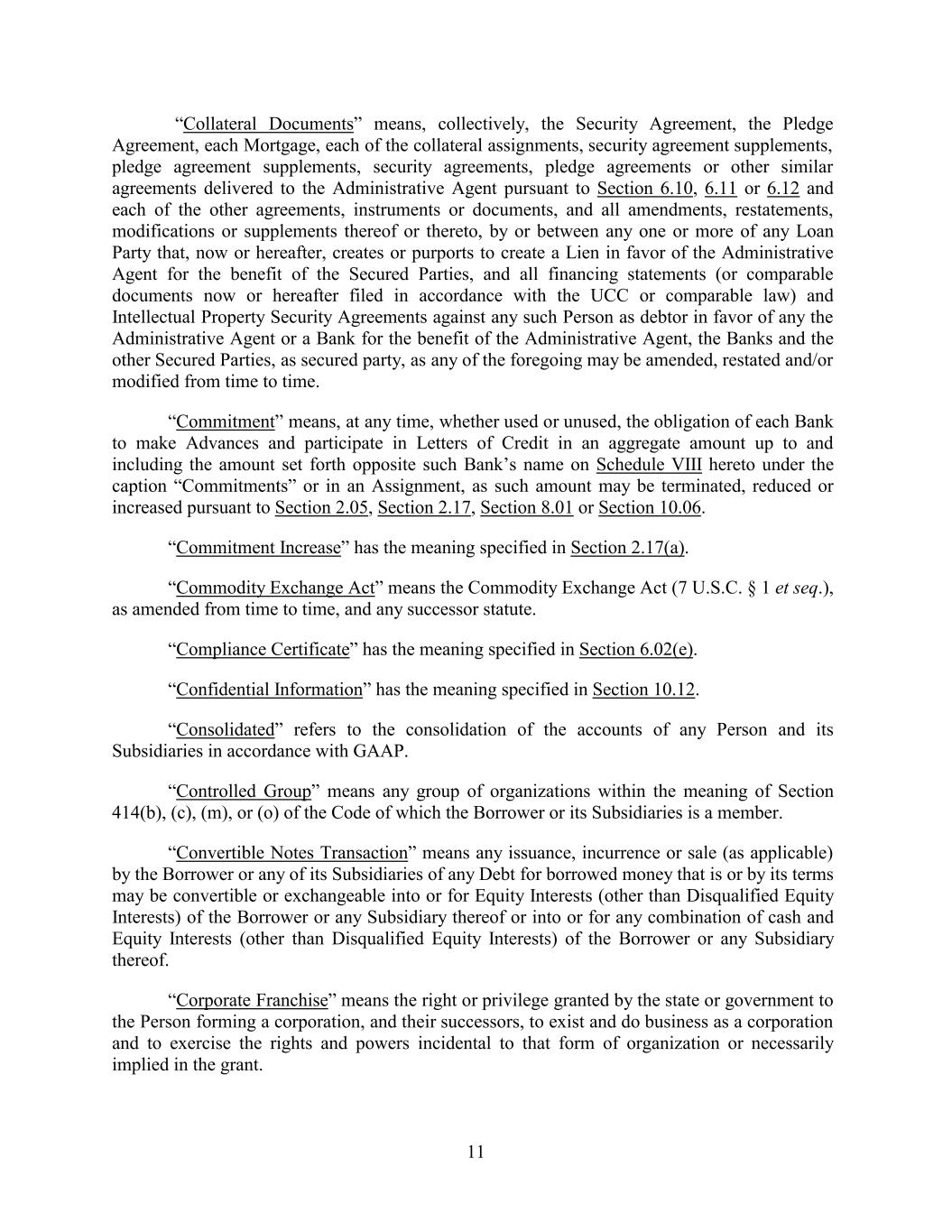 “Collateral Documents” means, collectively, the Security Agreement, the Pledge Agreement, each Mortgage, each of the collateral assignments, security agreement supplements, pledge agreement supplements, security agreements, pledge agreements or other similar agreements delivered to the Administrative Agent pursuant to Section 6.10, 6.11 or 6.12 and each of the other agreements, instruments or documents, and all amendments, restatements, modifications or supplements thereof or thereto, by or between any one or more of any Loan Party that, now or hereafter, creates or purports to create a Lien in favor of the Administrative Agent for the benefit of the Secured Parties, and all financing statements (or comparable documents now or hereafter filed in accordance with the UCC or comparable law) and Intellectual Property Security Agreements against any such Person as debtor in favor of any the Administrative Agent or a Bank for the benefit of the Administrative Agent, the Banks and the other Secured Parties, as secured party, as any of the foregoing may be amended, restated and/or modified from time to time. “Commitment” means, at any time, whether used or unused, the obligation of each Bank to make Advances and participate in Letters of Credit in an aggregate amount up to and including the amount set forth opposite such Bank’s name on Schedule VIII hereto under the caption “Commitments” or in an Assignment, as such amount may be terminated, reduced or increased pursuant to Section 2.05, Section 2.17, Section 8.01 or Section 10.06. “Commitment Increase” has the meaning specified in Section 2.17(a). “Commodity Exchange Act” means the Commodity Exchange Act (7 U.S.C. § 1 et seq.), as amended from time to time, and any successor statute. “Compliance Certificate” has the meaning specified in Section 6.02(e). “Confidential Information” has the meaning specified in Section 10.12. “Consolidated” refers to the consolidation of the accounts of any Person and its Subsidiaries in accordance with GAAP. “Controlled Group” means any group of organizations within the meaning of Section 414(b), (c), (m), or (o) of the Code of which the Borrower or its Subsidiaries is a member. “Convertible Notes Transaction” means any issuance, incurrence or sale (as applicable) by the Borrower or any of its Subsidiaries of any Debt for borrowed money that is or by its terms may be convertible or exchangeable into or for Equity Interests (other than Disqualified Equity Interests) of the Borrower or any Subsidiary thereof or into or for any combination of cash and Equity Interests (other than Disqualified Equity Interests) of the Borrower or any Subsidiary thereof. “Corporate Franchise” means the right or privilege granted by the state or government to the Person forming a corporation, and their successors, to exist and do business as a corporation and to exercise the rights and powers incidental to that form of organization or necessarily implied in the grant. 11